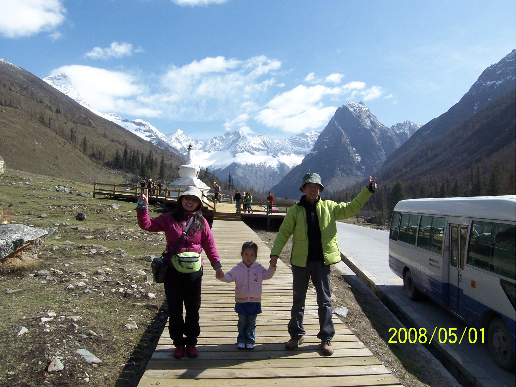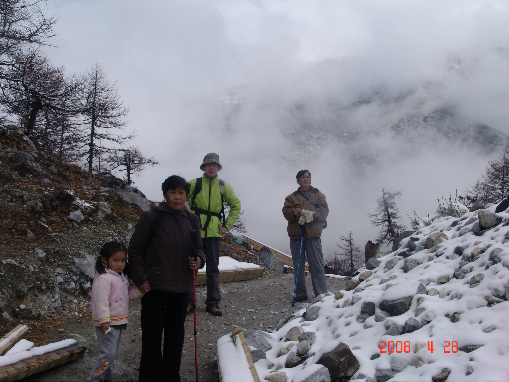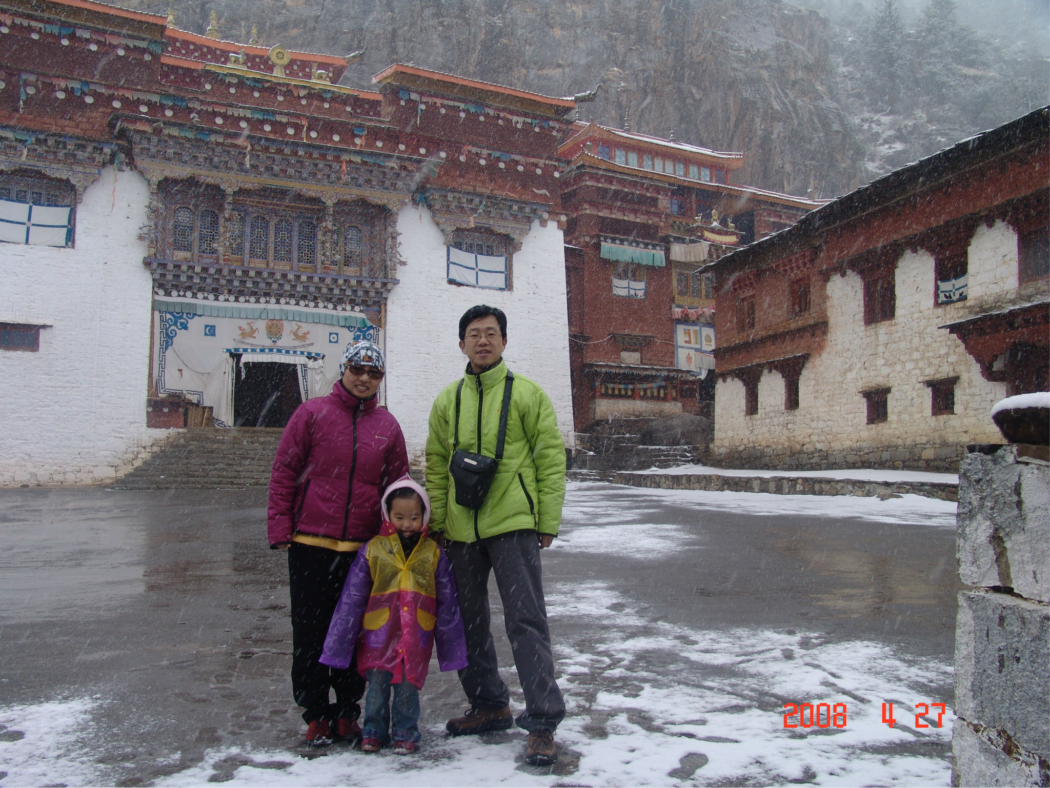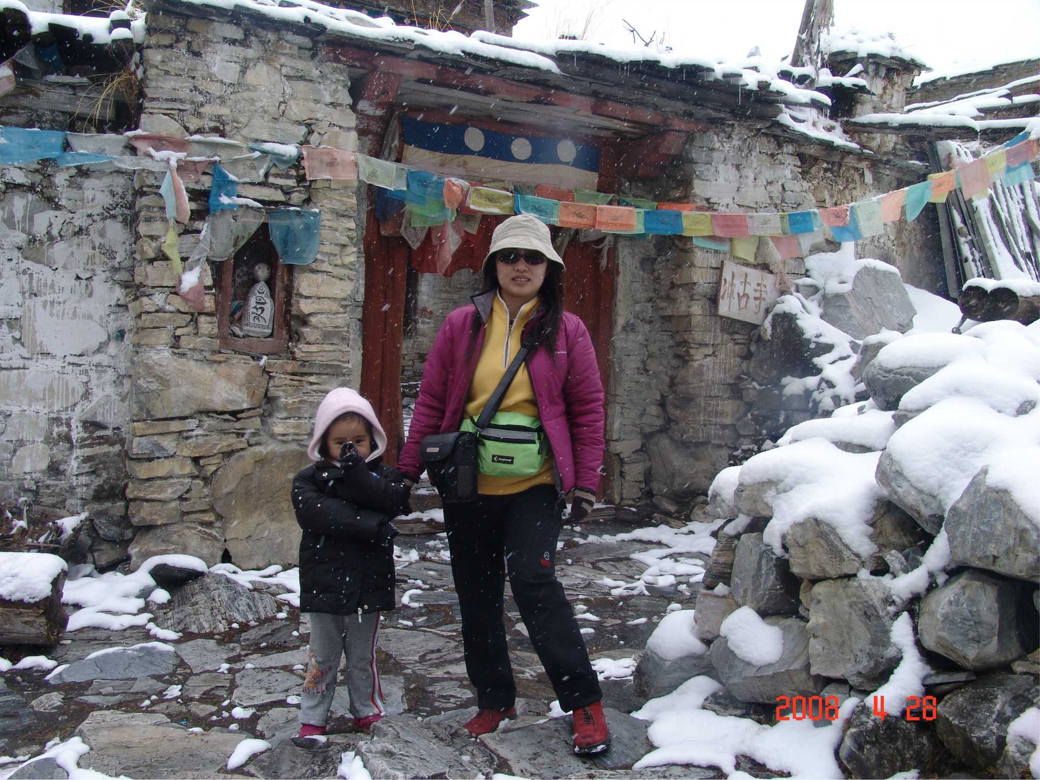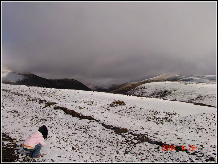 当天,是dadd的生日,一个多么特别的生日。因为当时他正经历人生的第一次,也是最苦的一次挫折,这也是我们为什么出游的原因。他,爱雨天,爱雪。大早,我们从亚丁返回,一路白茫茫的一片洁白的世界,我的内心深深的激动,感谢诸神给daddy送来这绝无仅有的礼物!雪越下越大,到了一个制高点,我们的车就陷在雪中一丝不能挪动了,任凭司机师傅和我们五口之家全力以赴。可能是老天的意思:慢一点,停下来,欣赏一下美好的身边吧。后来,此程唯一的一路驴友--三人一司机来了,用他们的车把我们拖出雪地,哈哈。难忘啊,天地之间,依然没了之间,恍恍惚是在天堂之中小歇了片刻