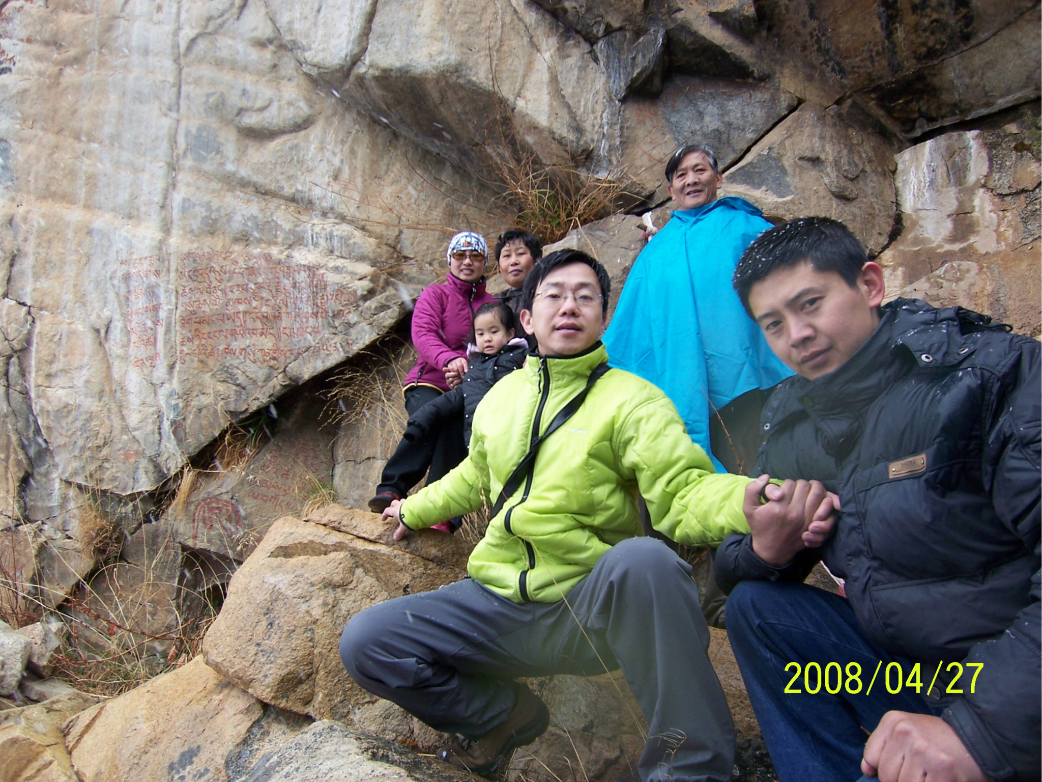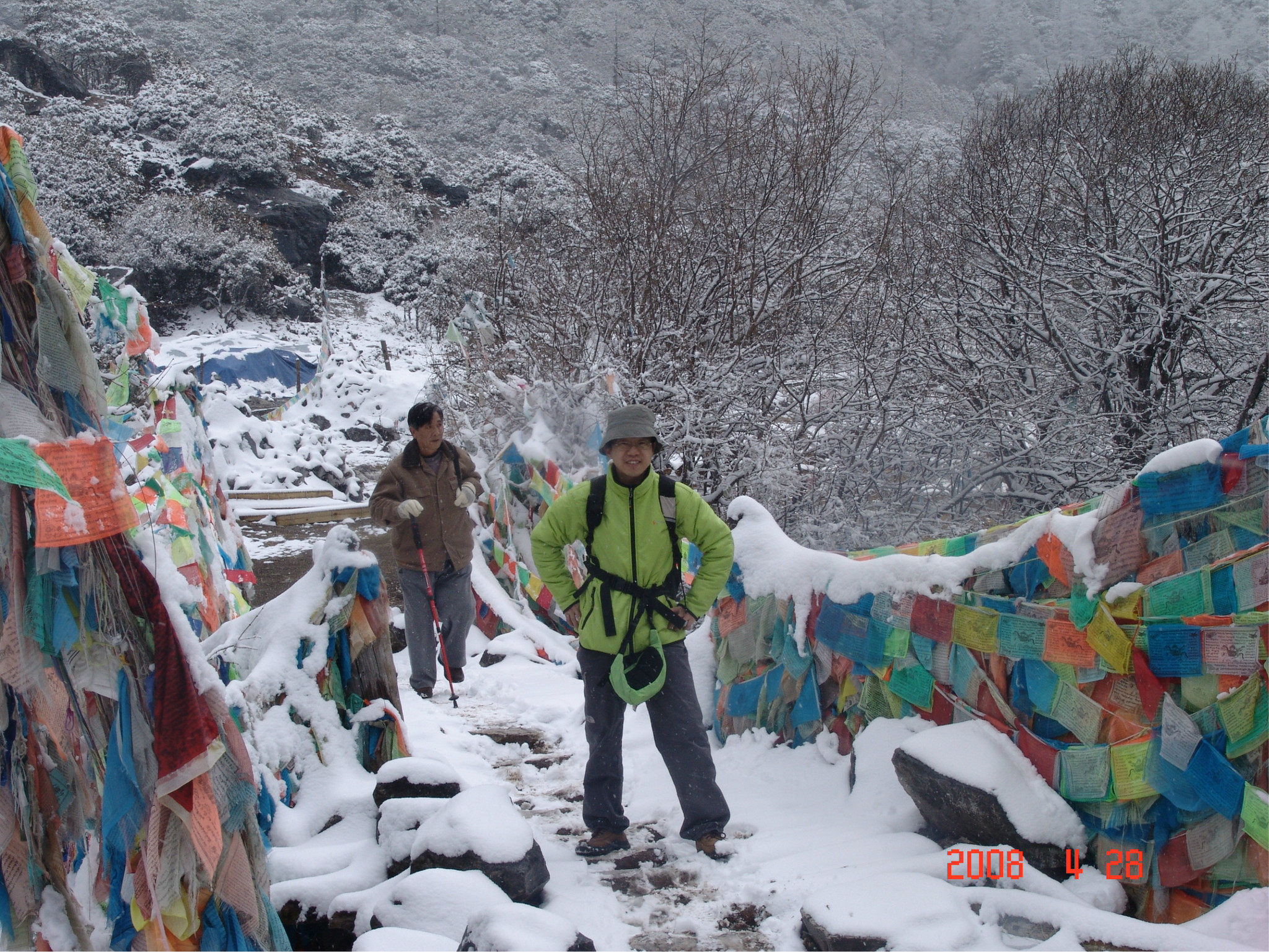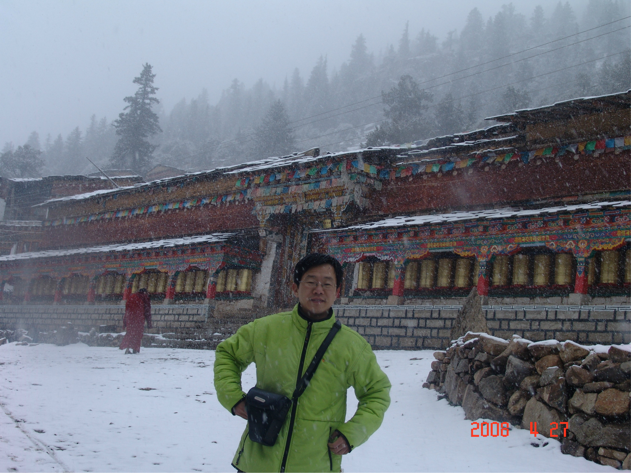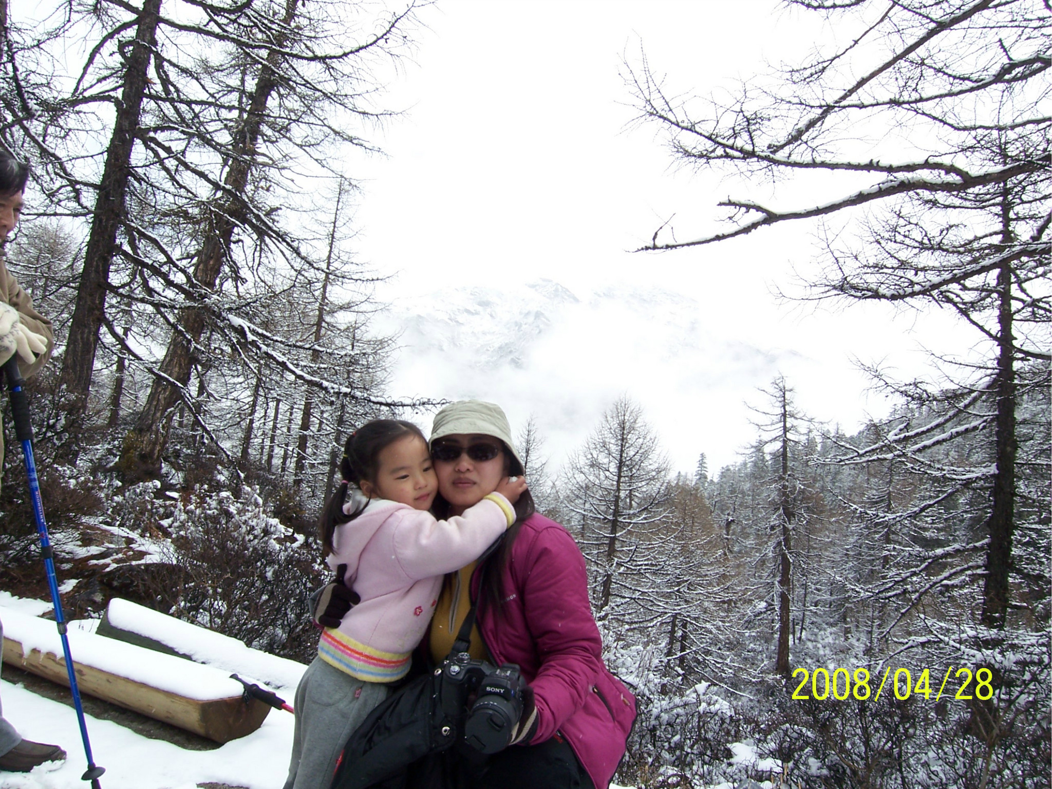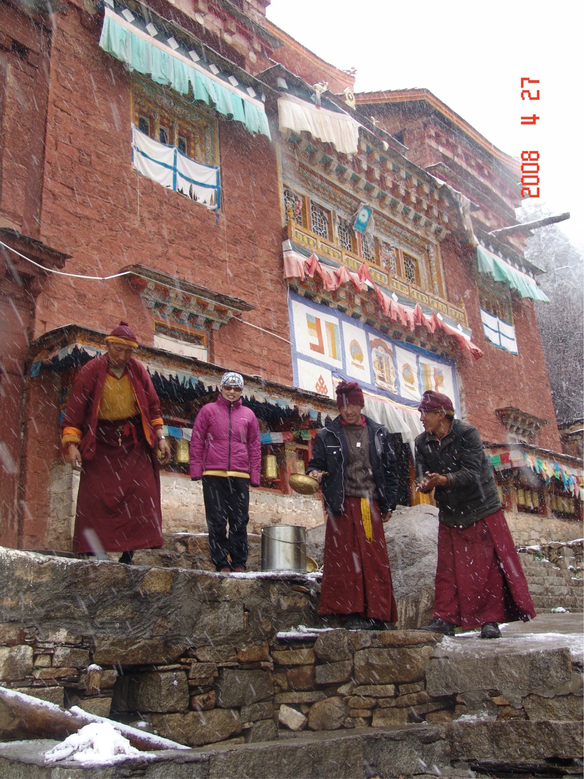 当天,是dadd的生日,一个多么特别的生日。因为当时他正经历人生的第一次,也是最苦的一次挫折,这也是我们为什么出游的原因。他,爱雨天,爱雪。大早,我们从亚丁返回,一路白茫茫的一片洁白的世界,我的内心深深的激动,感谢诸神给daddy送来这绝无仅有的礼物!雪越下越大,到了一个制高点,我们的车就陷在雪中一丝不能挪动了,任凭司机师傅和我们五口之家全力以赴。可能是老天的意思:慢一点,停下来,欣赏一下美好的身边吧。后来,此程唯一的一路驴友--三人一司机来了,用他们的车把我们拖出雪地,哈哈。难忘啊,天地之间,依然没了之间,恍恍惚是在天堂之中小歇了片刻