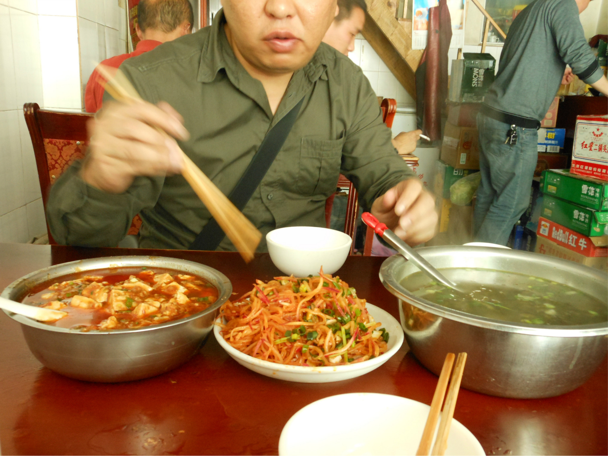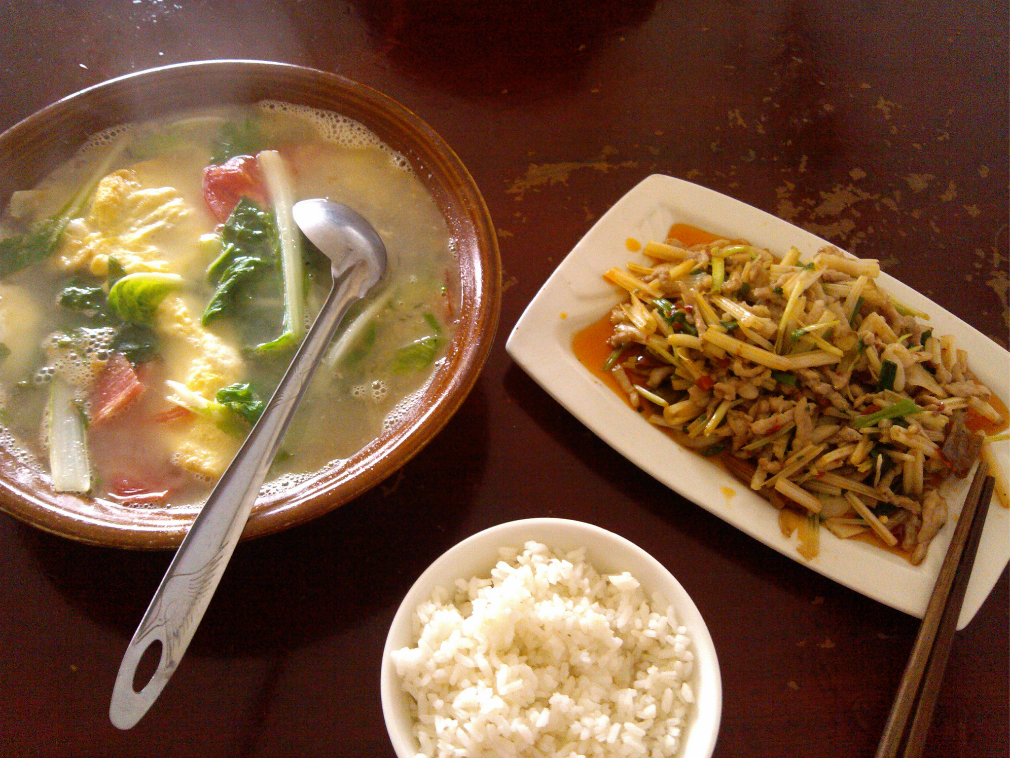 我走到公路边准备再搭一辆车到雅安 。这次我胆子稍微大点,不一会一辆大众停了下来,他虽然去的不是雅安 但还算同路。一对上海 夫妻,很高兴的捎上了我,一路同样有说有笑,他们是上海 人,在成都 做生意,这几天空闲便带着老婆出城玩一下。在走到雅安 与他们目的地分叉口的时候,他老婆对他老公说,要不我们把小姑娘带进去吧,反正就绕一下。他老公听罢,往左一拐进去雅安 了,走了两公里发现前面竟有个收费站,我当即就后悔了,特别过意不去,他们本来就不是去雅安 的,为了我少走点路把我送进去竟还付了50块过路费,我让他们掉头,可是是掉不了头的。虽他老婆一直说没关系的,但还是特别过意不去,真是太好人了。我万分感激后下了车。在附近找了一家餐馆把午饭解决了,真没想到雅安 吃饭超便宜,十几块好大一盘芹菜炒肉,一份6块的鸡蛋番茄汤里面竟有三个蛋超多青菜超多番茄实在吃不完。