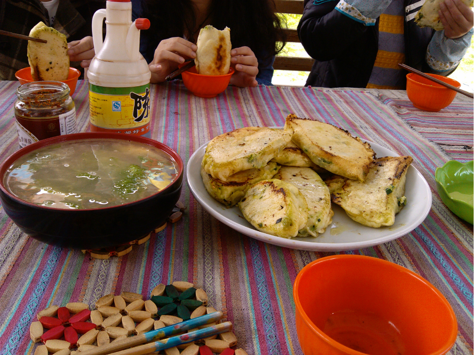 中午跟老板一起吃饭(他的义工们做的韭菜盒子)