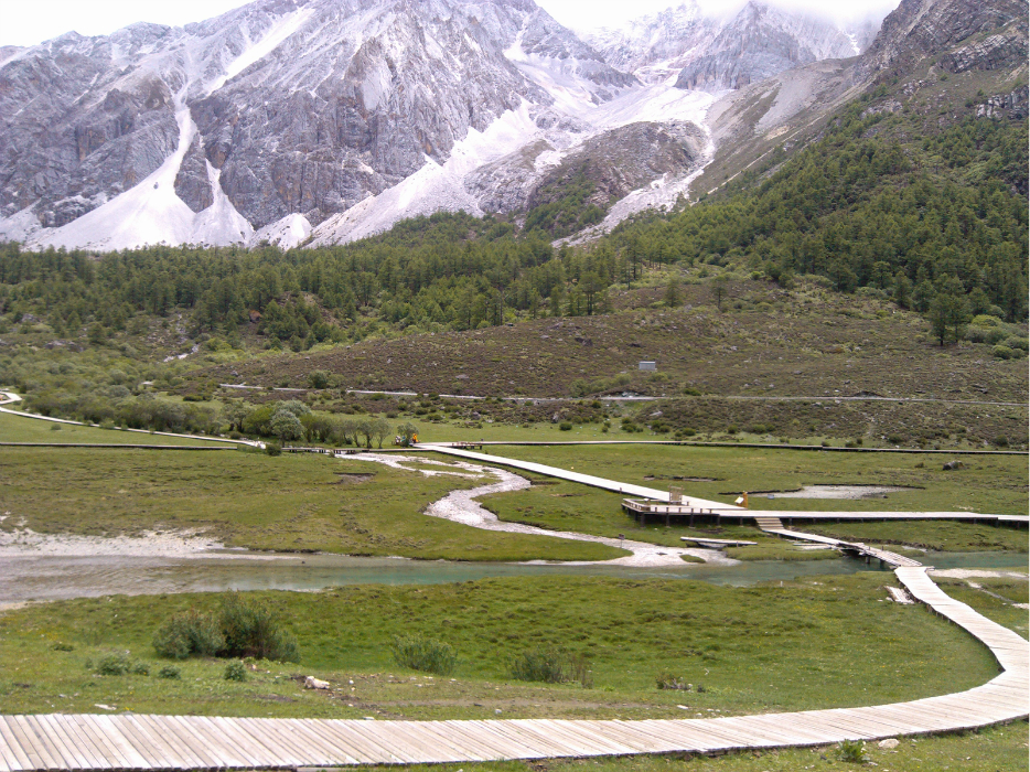 巧的是爬着爬着我远远望见前方有几个熟悉的身影,再近点一看,原来是前晚搭我到稻城 的那几个老驴,他们也来亚丁 了。他们说明天要去香格里拉 ,要能走的话就捎我一段,太好了,可是~~~~我的大包还在稻城 呢,此刻我悔的肠子都青了,看来包还是要随身背啊!稻城 到香格里拉 的车可是非常不好搭。徒步到冲古寺后还要坐电瓶车才能到洛绒牛场。
