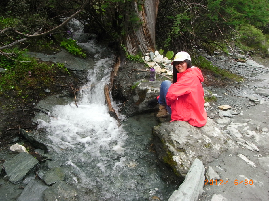 正在睡眼朦胧的时候,只听见酒店老板边敲房门,边说,小姑娘,起床了,要不要一起吃早点?!不收你钱。我连忙回答,要!! 洗漱完去厨房里吃了两碗稀饭,连声感谢。老板说让我早点走,这样好搭到车。临走前,我把昨天在雪山上取的一瓶圣水送给了老板,以表感激之情。老板是东北 的,真是好人。刚要出门就发现又下起了,没事,我的衣服是防水的。雨滴轻轻的打在我的头上,打在我的衣服上,裤子湿了,有点冷;背包湿了,有点重。公路边的岩壁上有圣女泉的泉水往下流淌着,冒着烟,像在仙境里。我在雨中哼着歌,转着圈圈,心情很是舒畅。这不心情好的时候,幸运就来了,一辆开往稻城 的面包车搭上了我。司机是做旅游的,专做稻城 亚丁 ,做了好多年了,一路上他跟我讲了好多游客关于高反的各种各样的死法,看来大部分人还是幸运的,真让人感慨!11点多就到了稻城 。今天就在客栈里休整吧,明早去香格里拉 ,当然幸运的话。