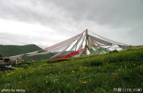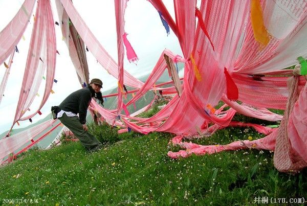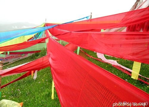 清晨7点多,我们就出门向遍插风马的山顶进发了。伞形的、旗帜状的、横拉的,粉红的、正红的、蓝色、橙色、黄色、绿色、白色,把我们看得透不过气来。天淅沥沥的开始下雨,我没穿已令镜头视觉疲劳的冲锋衣,只有summer带的一把小阳伞,没多久两人就各被淋湿了一半。不舍得就这样回头,我们坚持向经幡中心前进,凭借以往藏区游玩经验,我找到一从可供避雨的经幡。俩人猫腰蹲在经幡下,不及等得雨停,便开始伸出镜头胡乱拍照。
