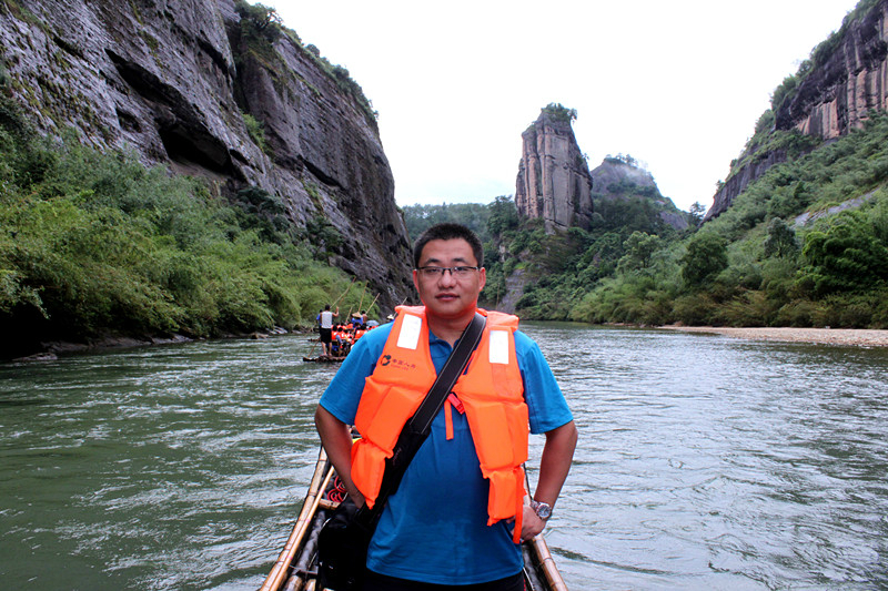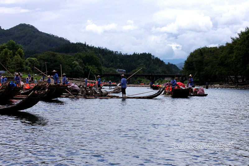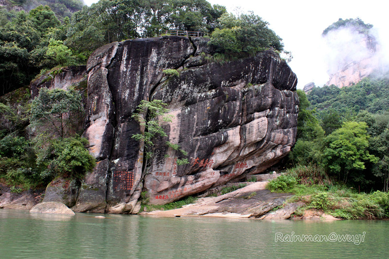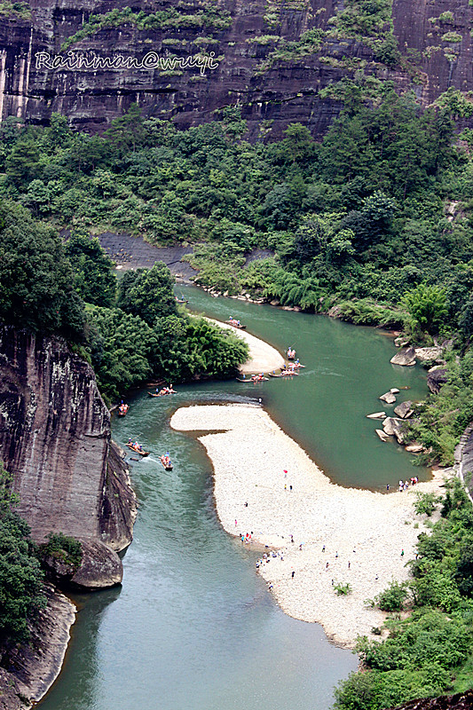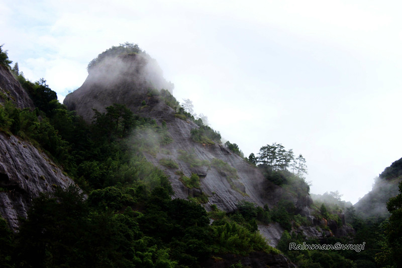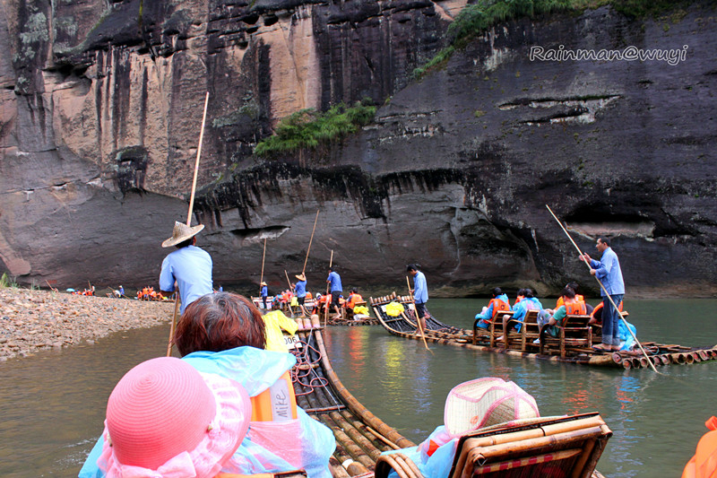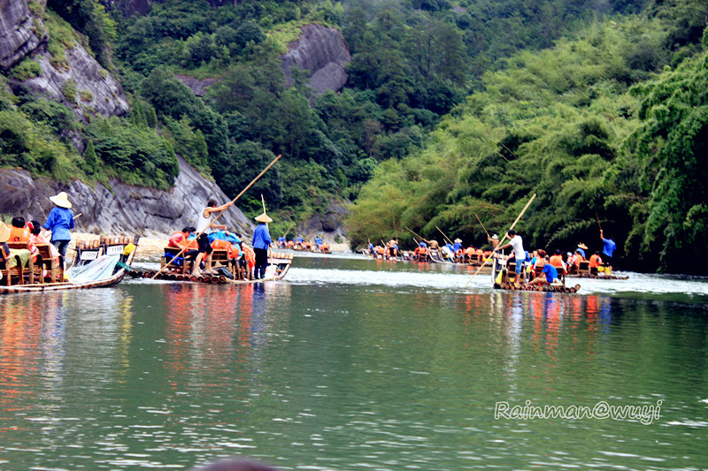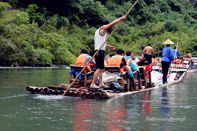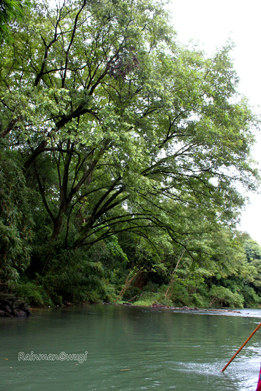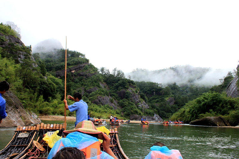 全程共九曲,一曲两弯,我们竹筏行驶到三曲时,天降暴雨,天地灰茫茫一片,什么也看不了。到五曲时,大雨变成了小雨。筏工说景色最壮观的就是六曲,也就是另外一个标志景点-天游峰。下过雨,会有云雾,景色更加迷人。心里暗暗祈祷,雨赶快停下来吧。天不遂人愿,六曲时雨还是淅淅沥沥的下,抬头望天游峰,景色真的很壮观、很震撼,天游峰拔地而起,山顶云雾缭绕,仿佛直插云霄,恍若仙境。直到此时,真正体会到了什么是“人在画中游”,真想拿出相机留住这美景,不,应该是这张画。可惜!到了七曲时,雨停了。终于可以拿出相机了,可最美的景色错过了。人生就是这样可遇不可求啊。和筏工聊天得知,他们是按照漂流的次数取酬的,每趟70元。竹筏是自己的,大概要3000-4000元。公司会按照表现来给予奖励。