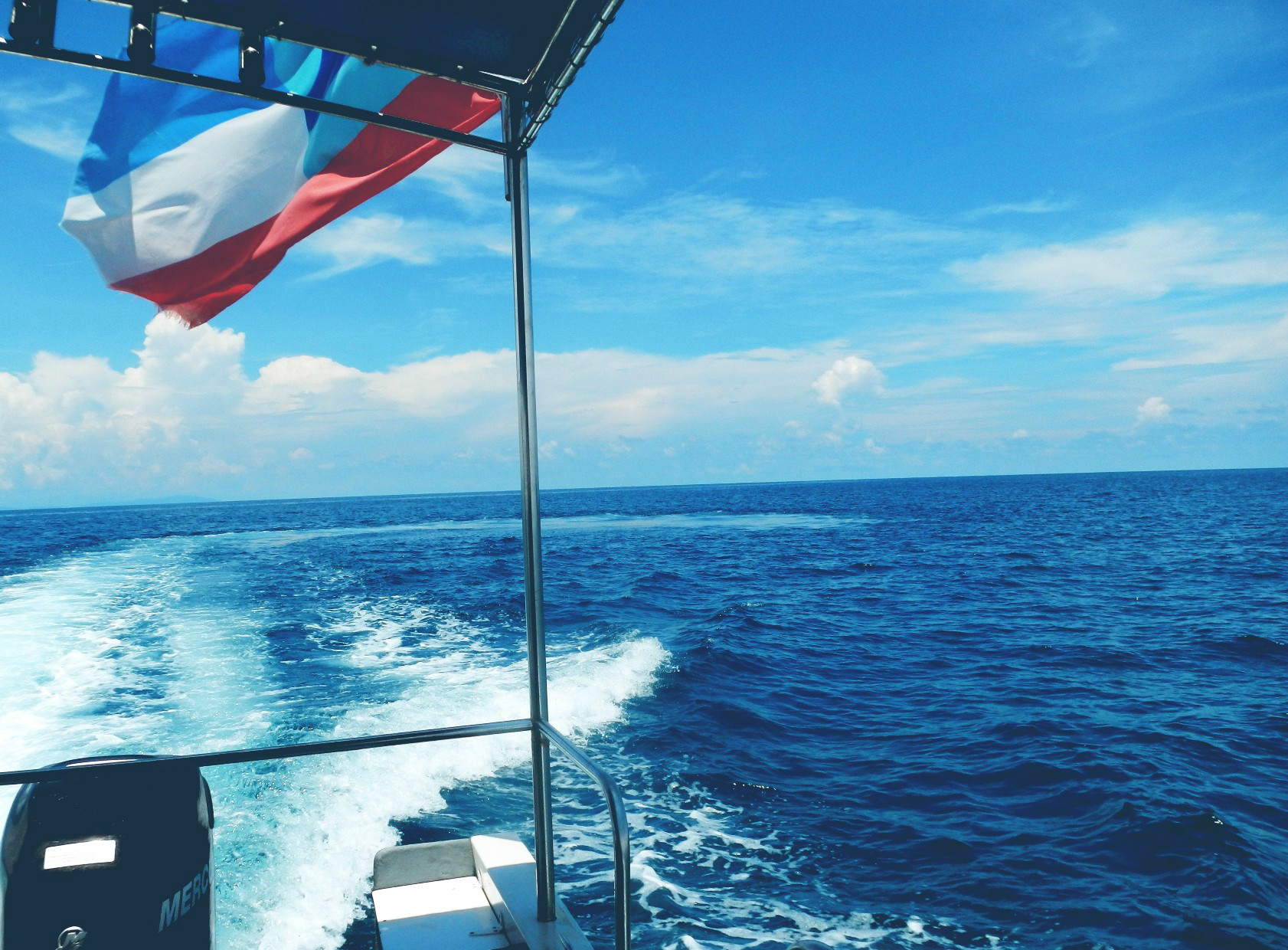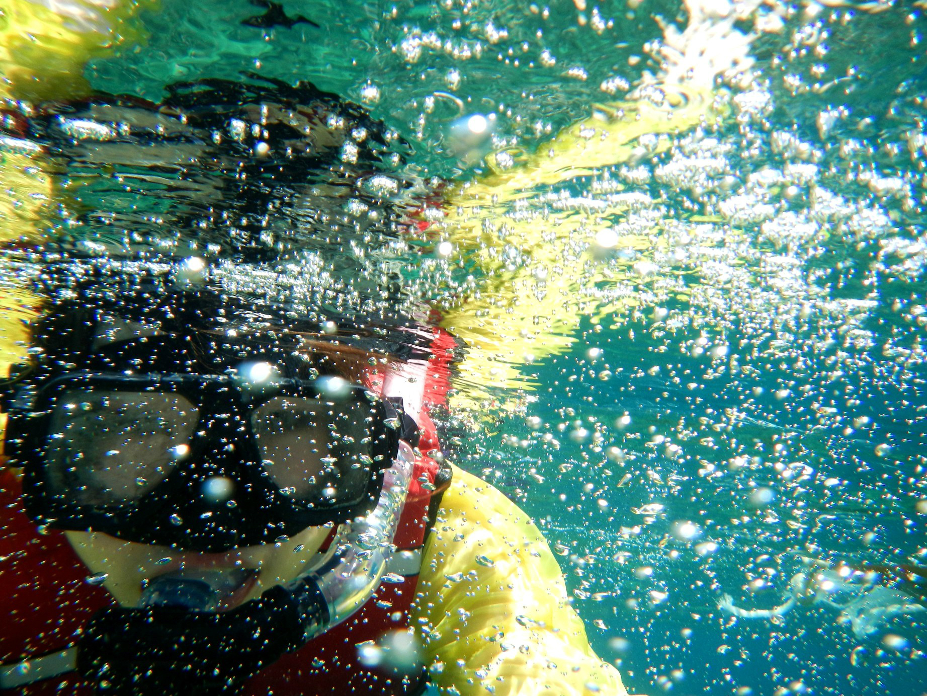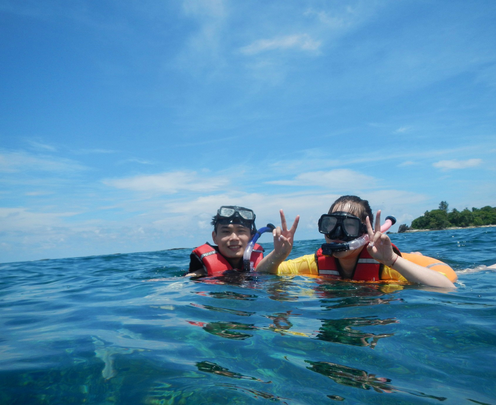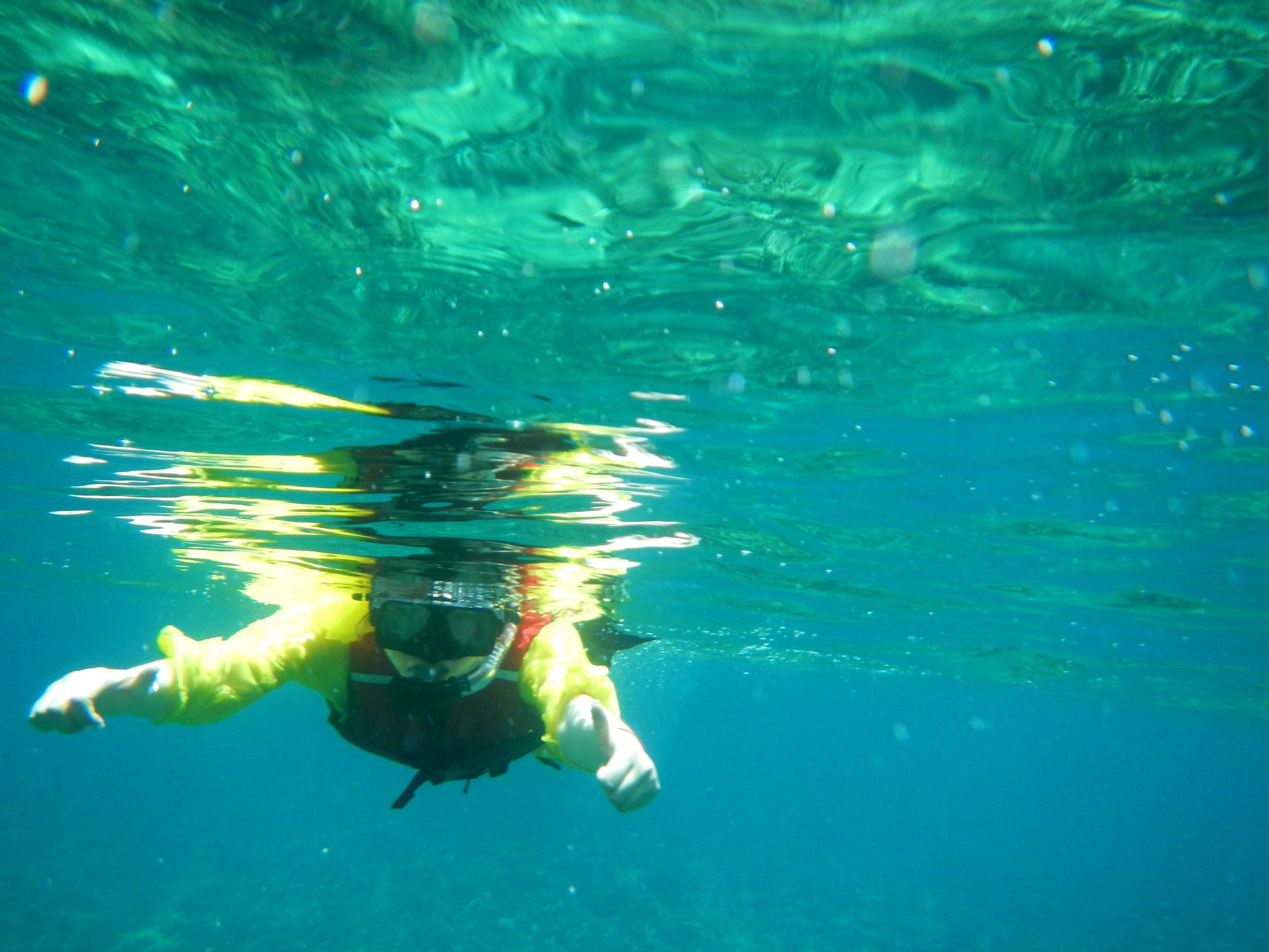 接着换了泳衣,奔向大海浮潜咯!!船员太好人了,我说自己不太会游泳,他就一路带着我,拉着我。。拽着我游很远。。还时不时潜下去捞些海星啥的给我玩~~由于之前已经有点晕船,再加上海 水一泡烈日一晒。。我游着游着就想吐了。。。他马上奋力拉着我游会艇边。真是感动~~我爱海边长大的人儿们·~