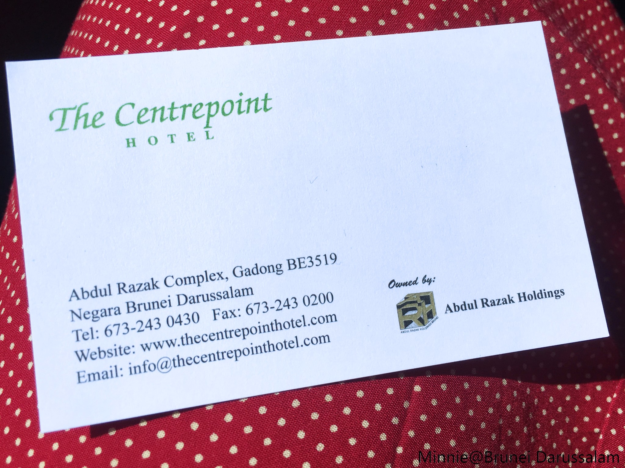 The CentrePoint Hotel,位于斯里巴加湾市中心的酒店,酒店设施都很干净齐全,小吃餐饮各种都很方便。文莱是伊斯兰教为国教的国家,禁烟禁酒,整个国家也无贩卖烟酒更无酒吧KTV夜生活等场所,几乎整个国家的商店最晚10点左右关门,所以住处的挑选还是要生活便利为好。