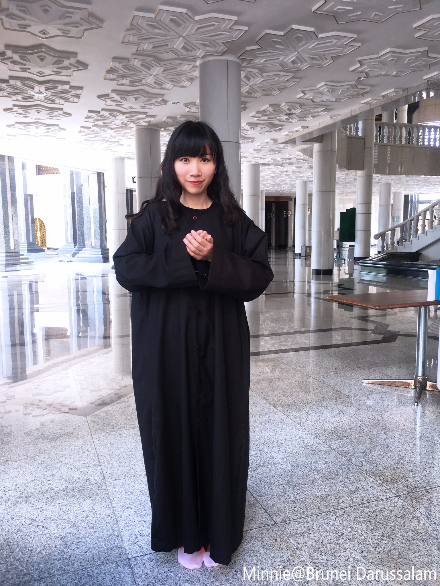 参观清真寺需着黑色长袍以示尊重。寺门口有一排摆放的长袍,选择大概的尺寸换上即可,记得要扣上所有扣子哦。另外最好穿双袜子,地砖还是很凉。