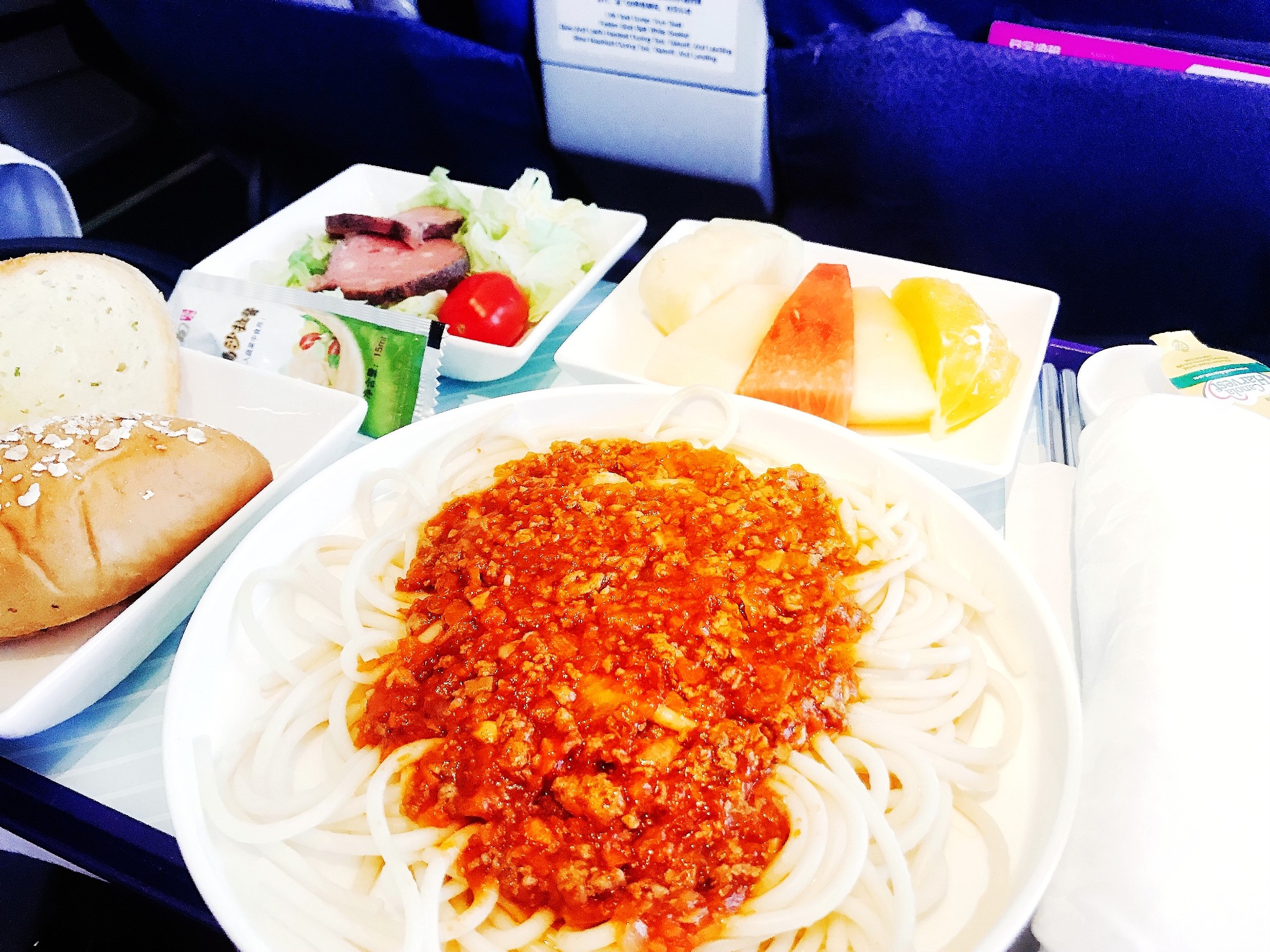 ,换上拖鞋、送上热毛巾、欢迎饮料、零食坚果、看着电影、享用午餐——牛肉酱意面、水果(菠萝、哈密瓜、西瓜、橙子)蔬菜色拉有肉哟、特别喜欢微热的烤面包配上点黄油,有点赞!