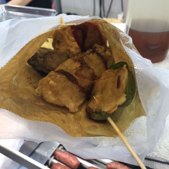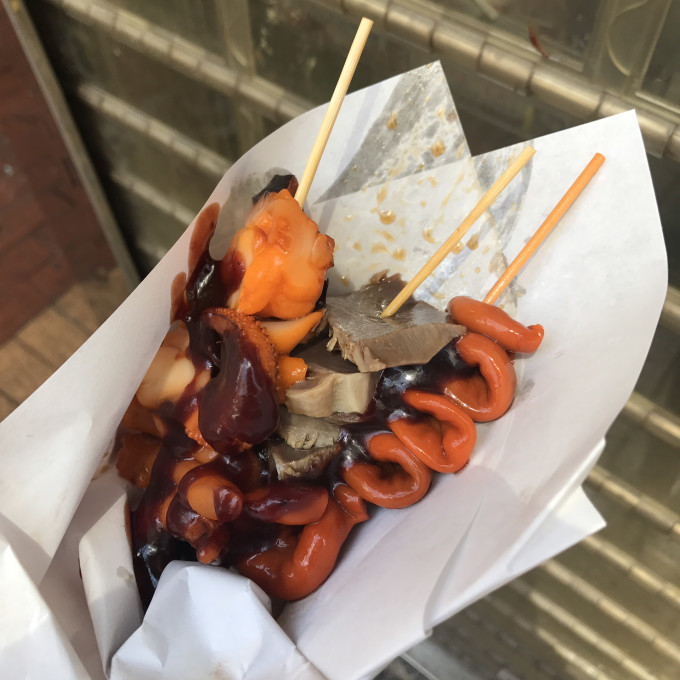 day1吃了一份鱼蛋20hkd但不够弹牙,本来是想给差评了但看到过很多人推荐所以最后一天还是去卖个小吃吃~图为最后一天的煎让三宝也是20hkd。以及第一天的鱼蛋~服务态度还好价格也低但味道一般般~