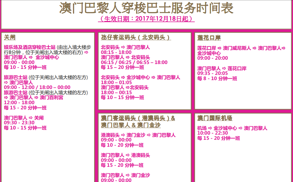 另外就是各大酒店之间都会有相应的发财车,就算有的酒店没有显示有直达的,但是完全可以蹭附近的车。但因为澳门酒店的大堂真的是很多,所以一定要问清你想坐的发财车是在哪一个大堂的门口。