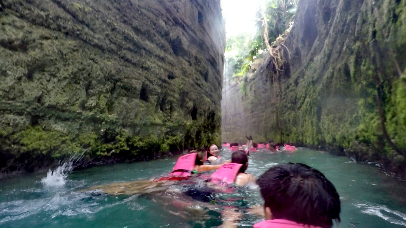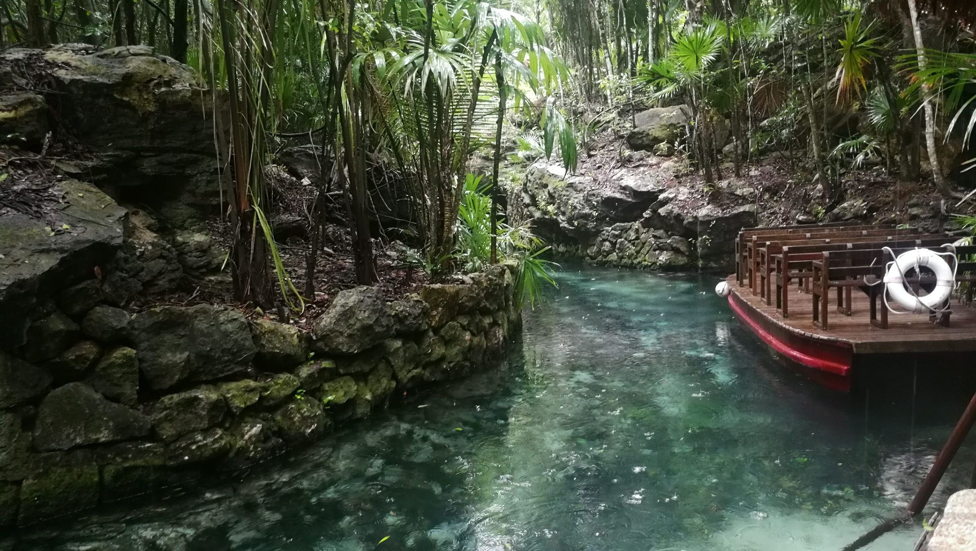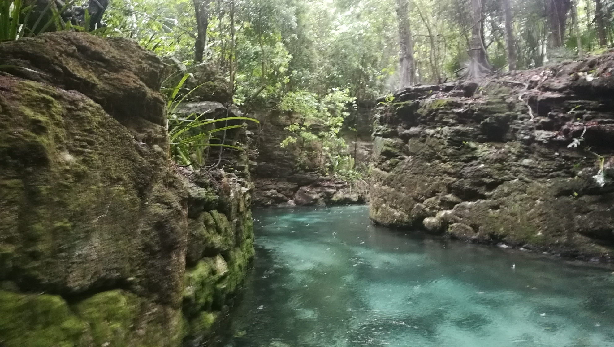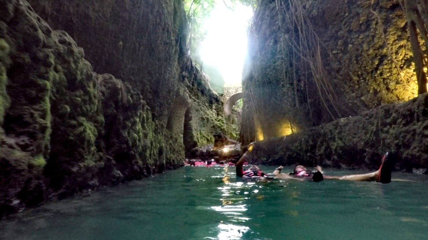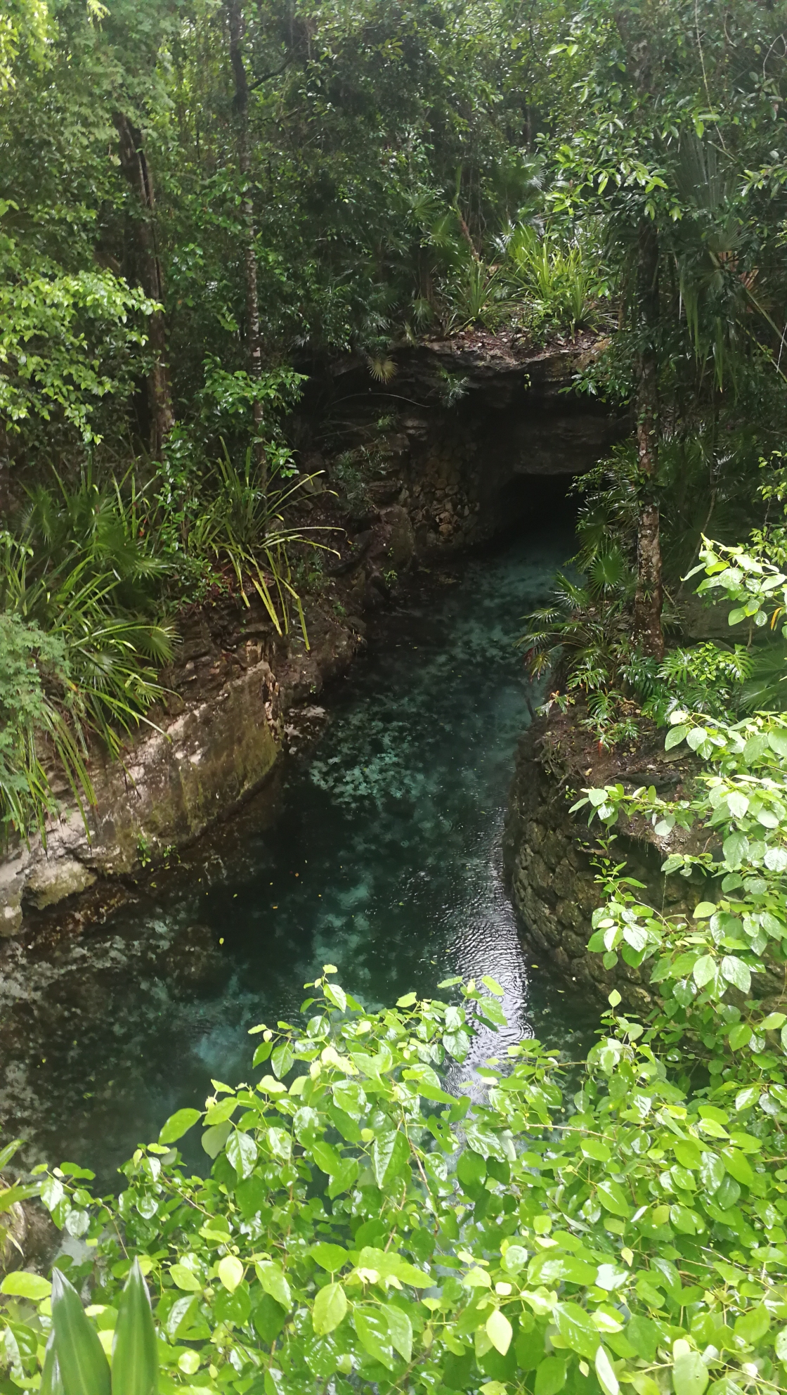 经过一系列的地下漂流,终于见天了。前方河道分叉,进入灌木丛。。