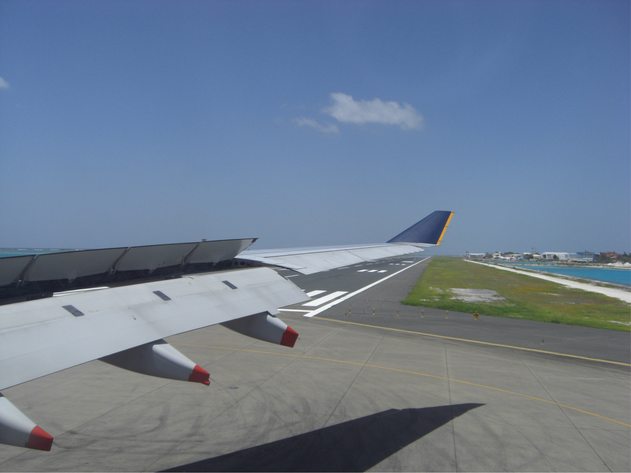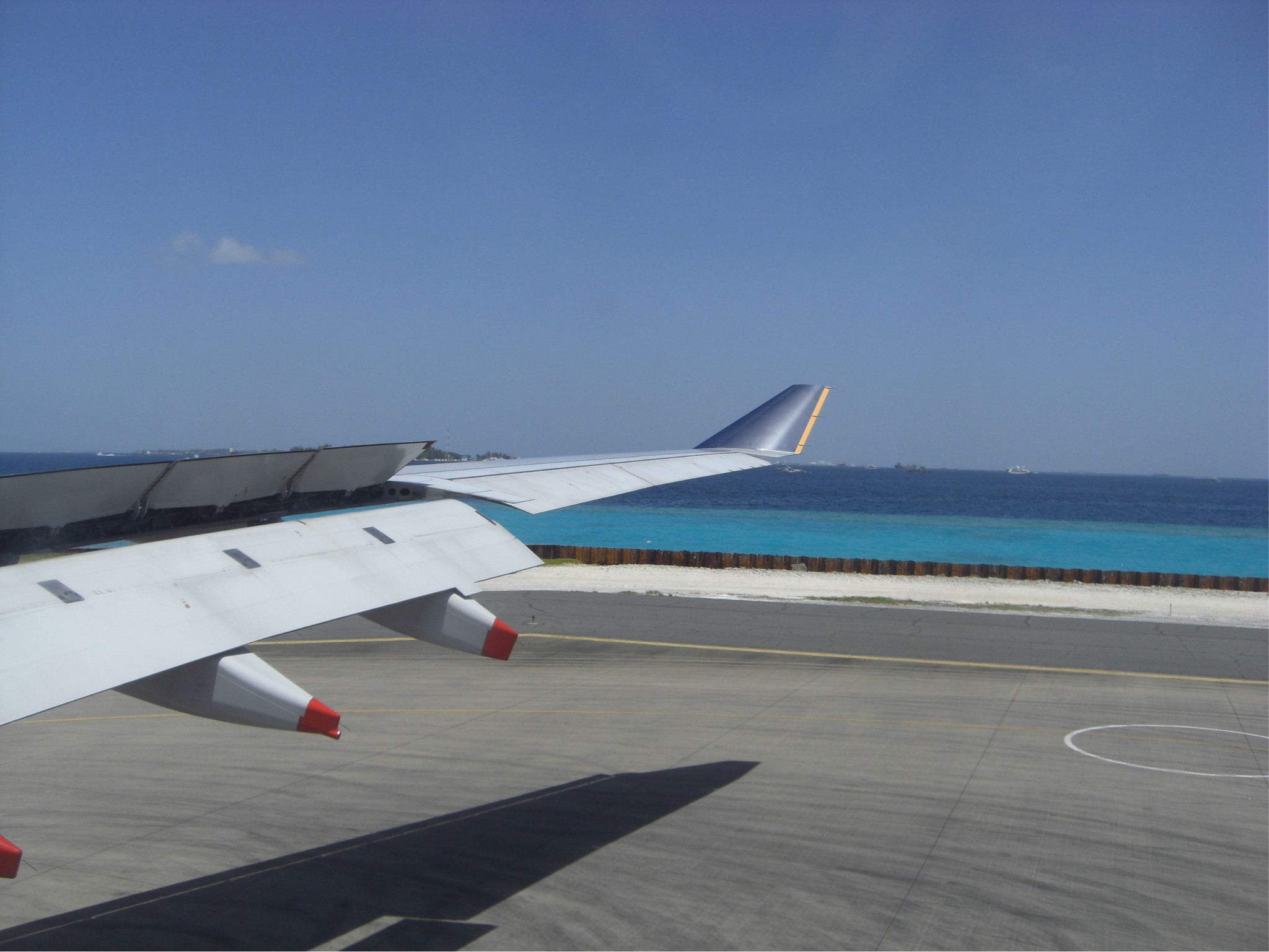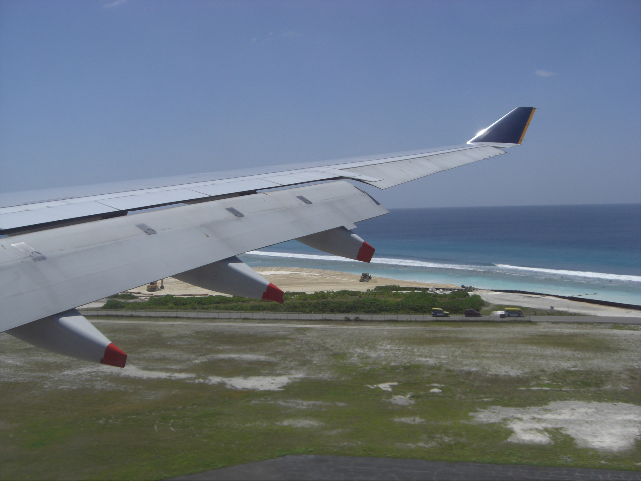 着陆的这一刻,被远处的海景美呆了,深蓝浅蓝很分明的一道界线,真狠不能马上冲出灰机去~