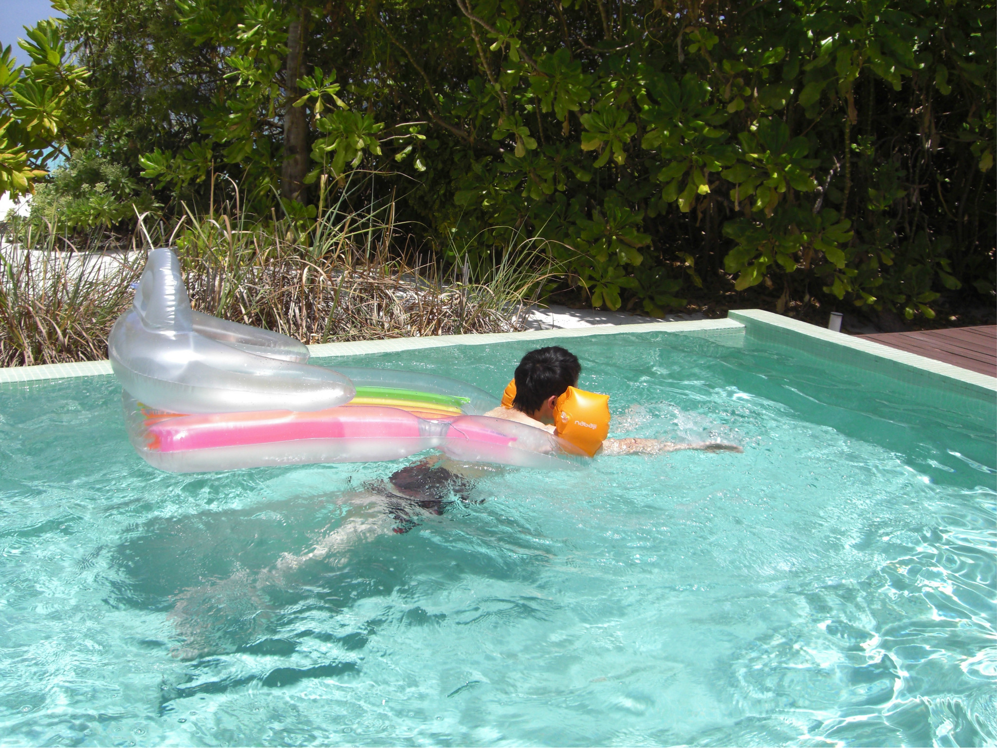 顺便说说那个套在手臂上的,原本是要买个泳池圈的,可惜买得晚了,临出发了还没收到,只能跑到迪卡农去买了个儿童用的,说明上说是能承受35KG,想着咱也就40KG而已,不管了,有的用总比没得用好。。。谁知到了池子里一试,不但我能用,小灰灰用着也没啥问题,虽然他也就55KG。。。好吧,2个瘦子