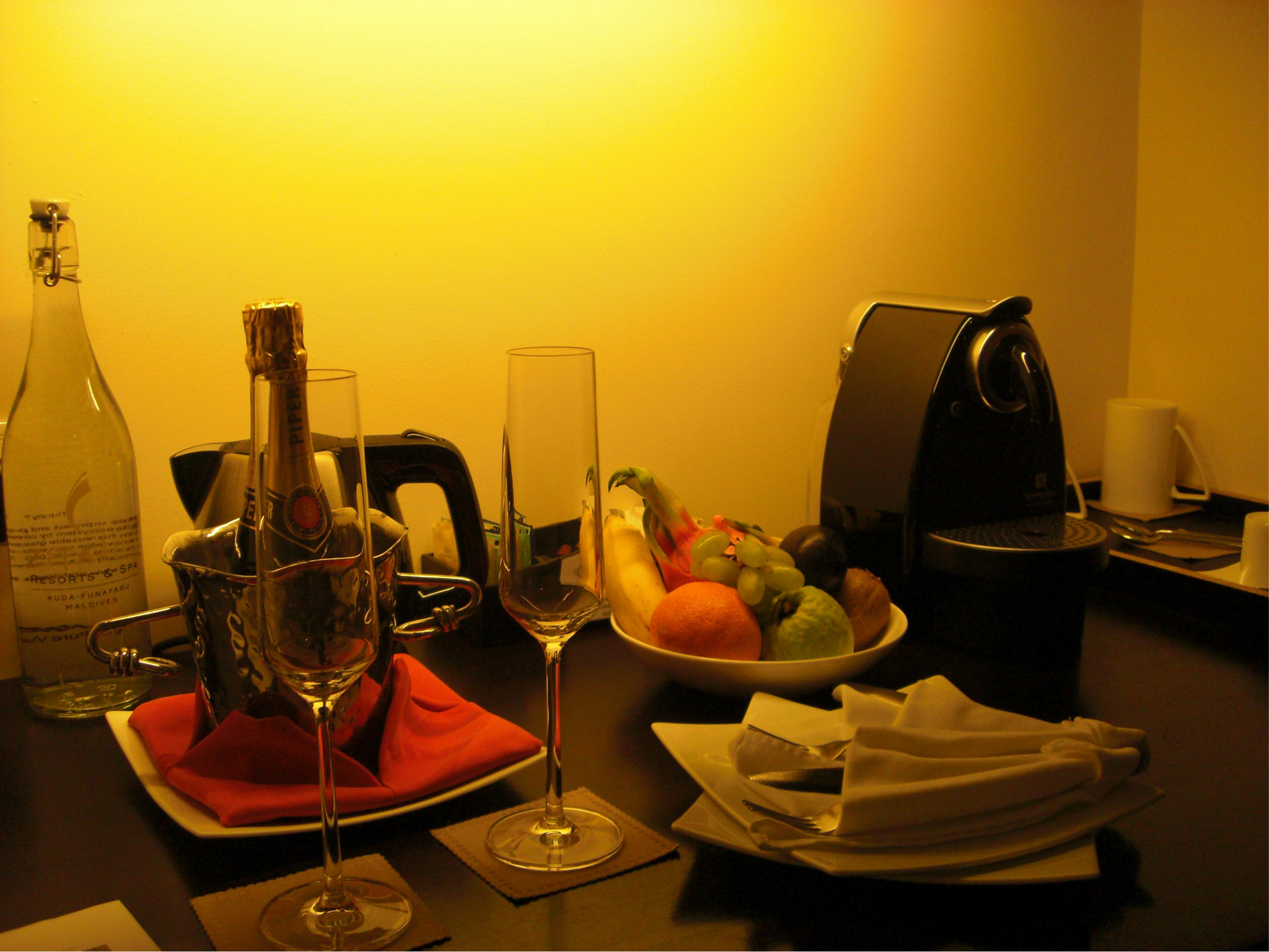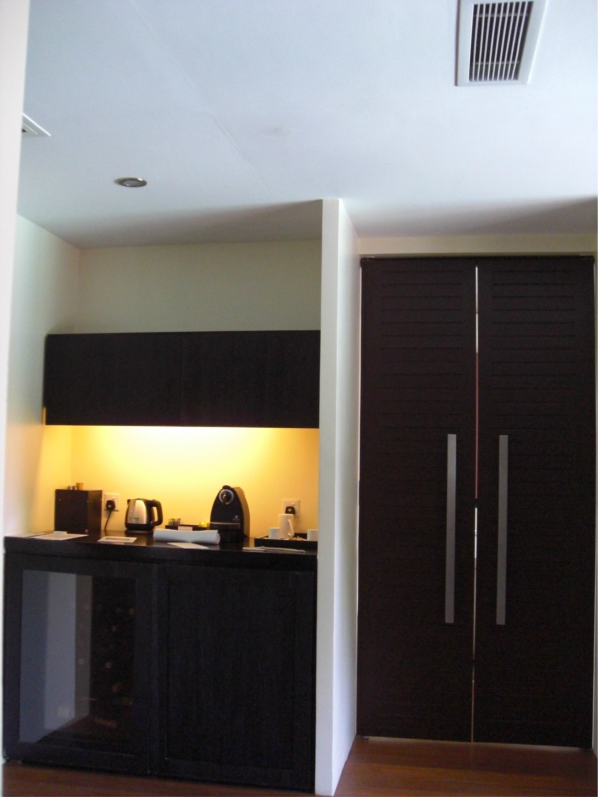 进入房间,首先看到的就是这个功能吧台哦,酒,咖啡,红茶,什么都有,第一天还会送上一杯香槟,一盆新鲜的水果,不过香槟味道不怎么样~