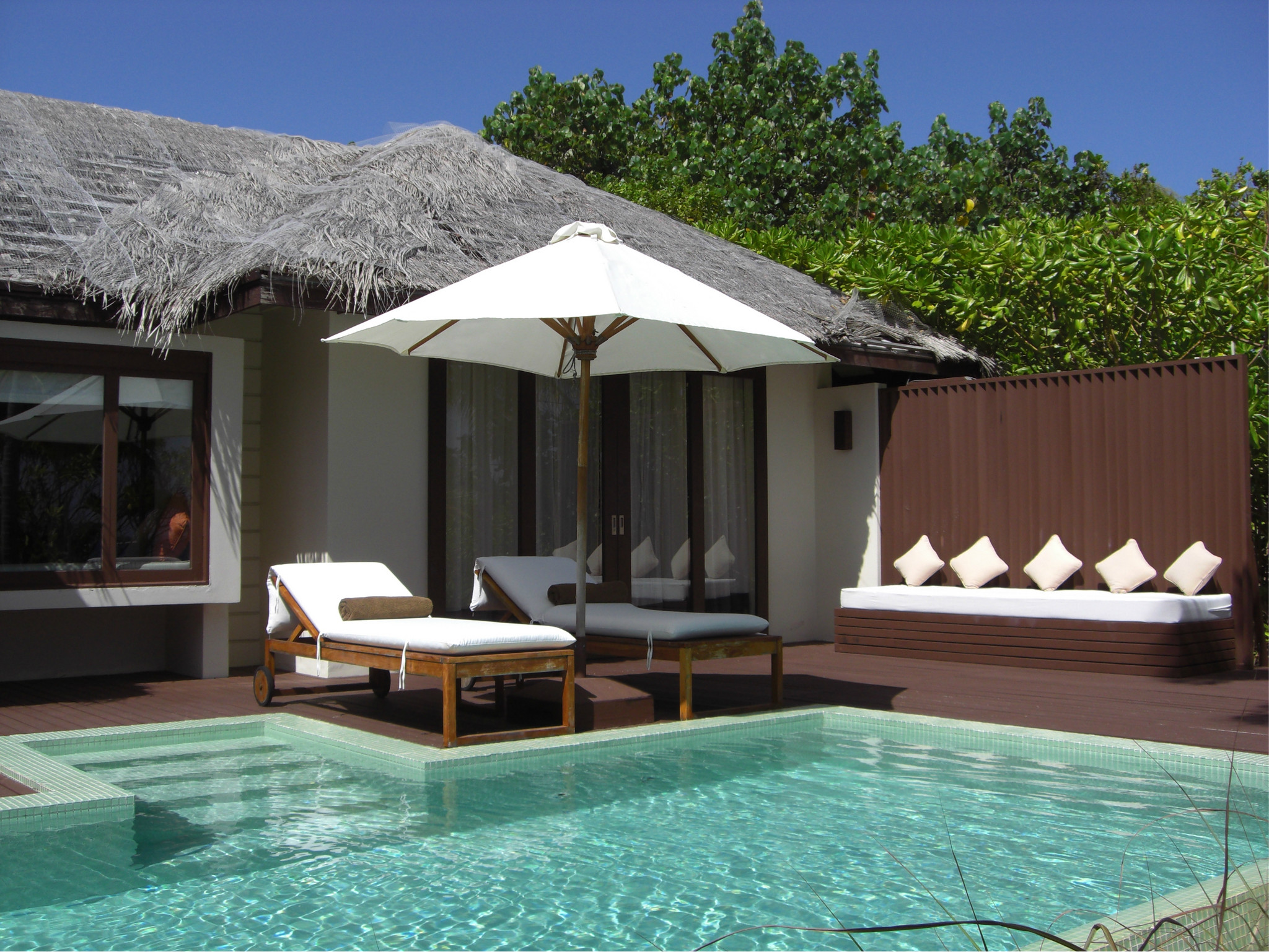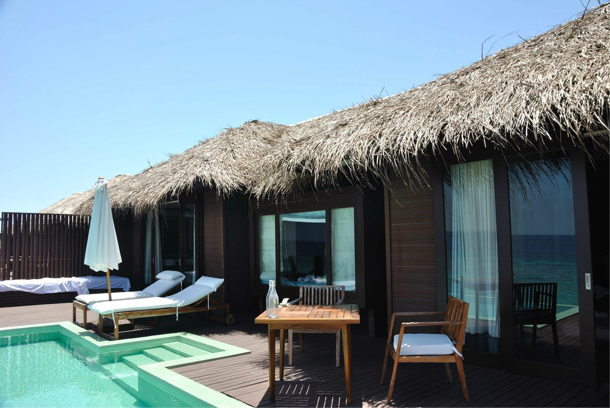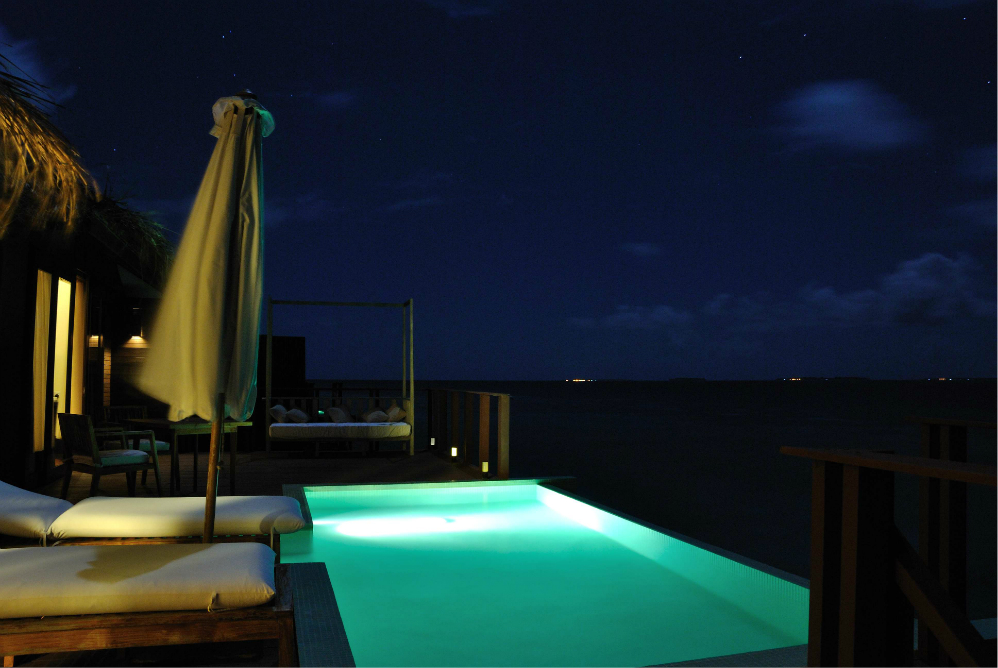 这个豪沙共有11间,都是在靠近排水屋的那片沙滩上的(见图1),自带泳池,基本在房间内就能看到大海,晚上还能听到海浪声,景色不错哦。
