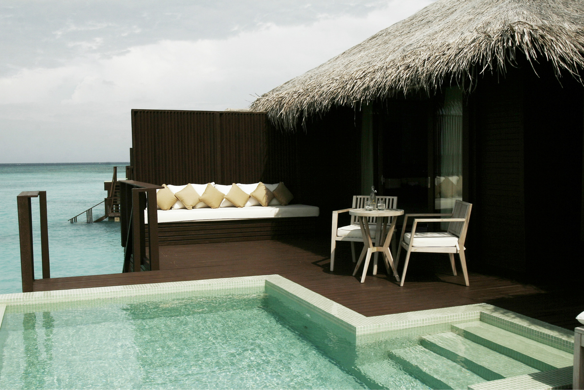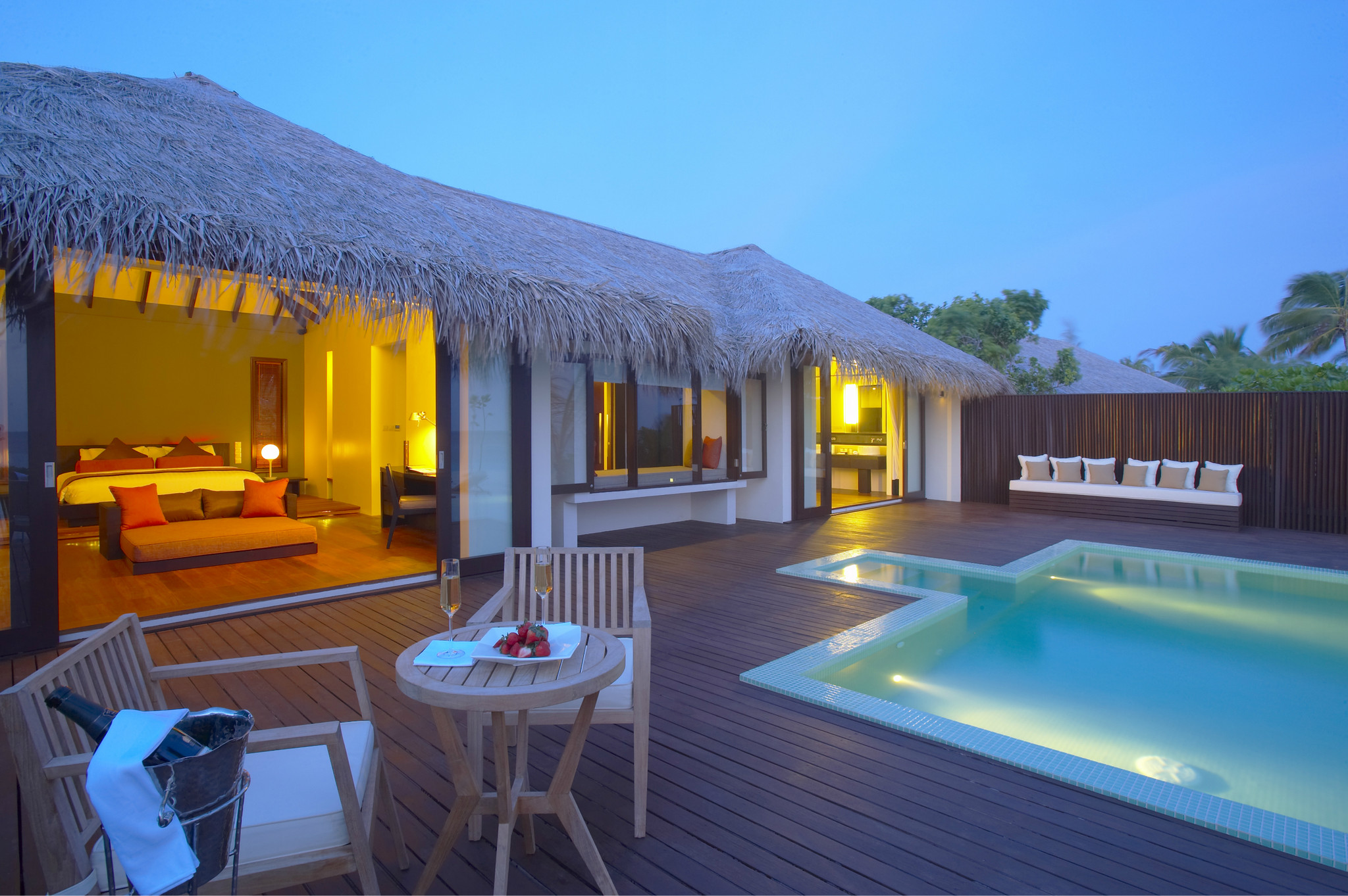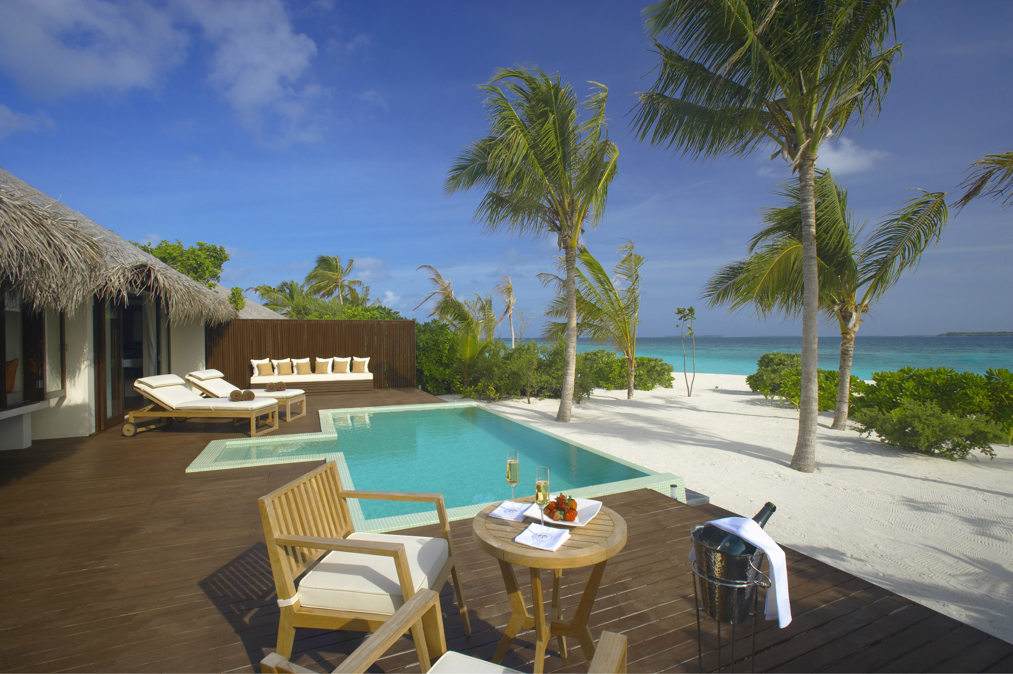 这个豪沙共有11间,都是在靠近排水屋的那片沙滩上的(见图1),自带泳池,基本在房间内就能看到大海,晚上还能听到海浪声,景色不错哦。