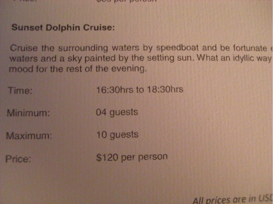 Z岛 不是很大,不像有些岛,家门口都放有自行车,绕岛散步一圈的话也就30分钟的样子。不过像日落巡航,出海海钓,看海豚,烧烤这些活动都是有的,想参加的话提前去前台预约下就OK啦,离岛 的时候会一并结算的。