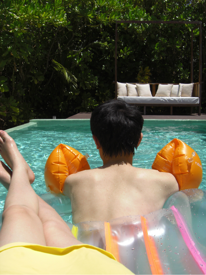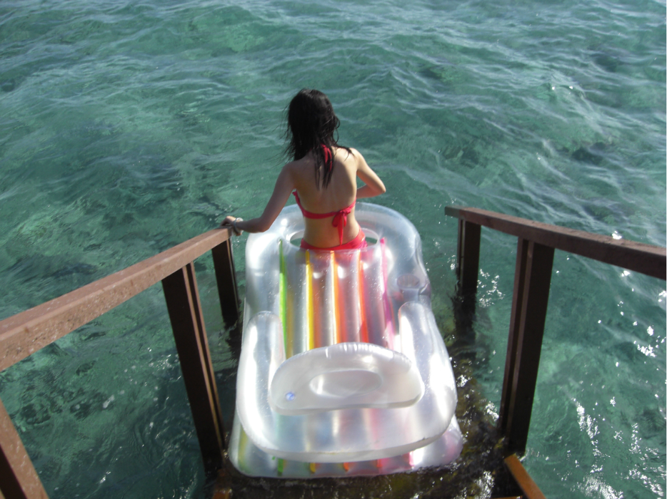 3. 浮床。如果你订的房间带泳池的话,那这个可是必不可少呢,坐着它漂在水上 打个盹或者是喝个咖啡啥的,想想都心动了吧~还有一个好处就是可以拿来当游泳圈用,因为前面还有个洞。