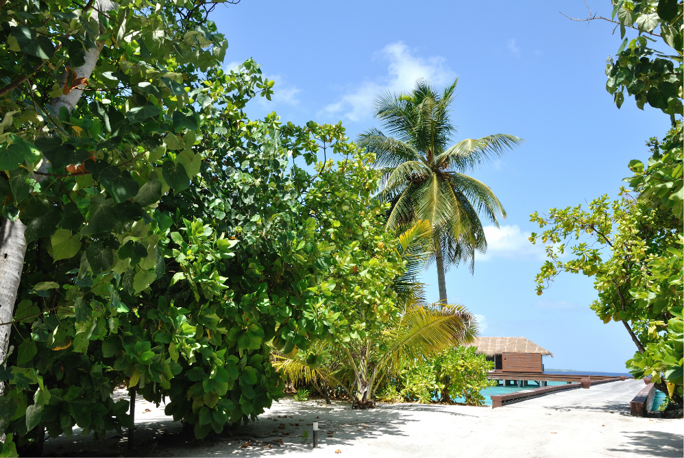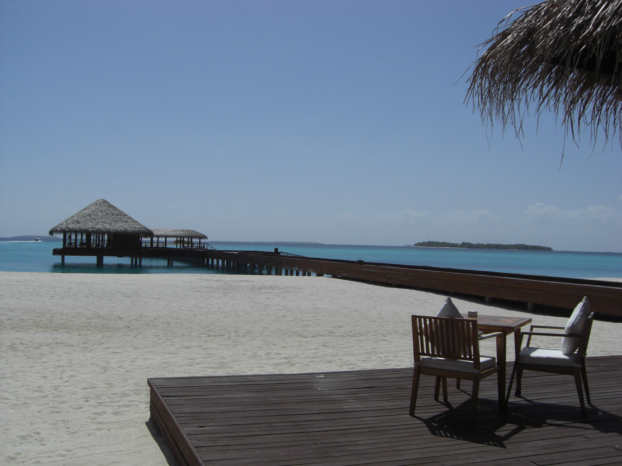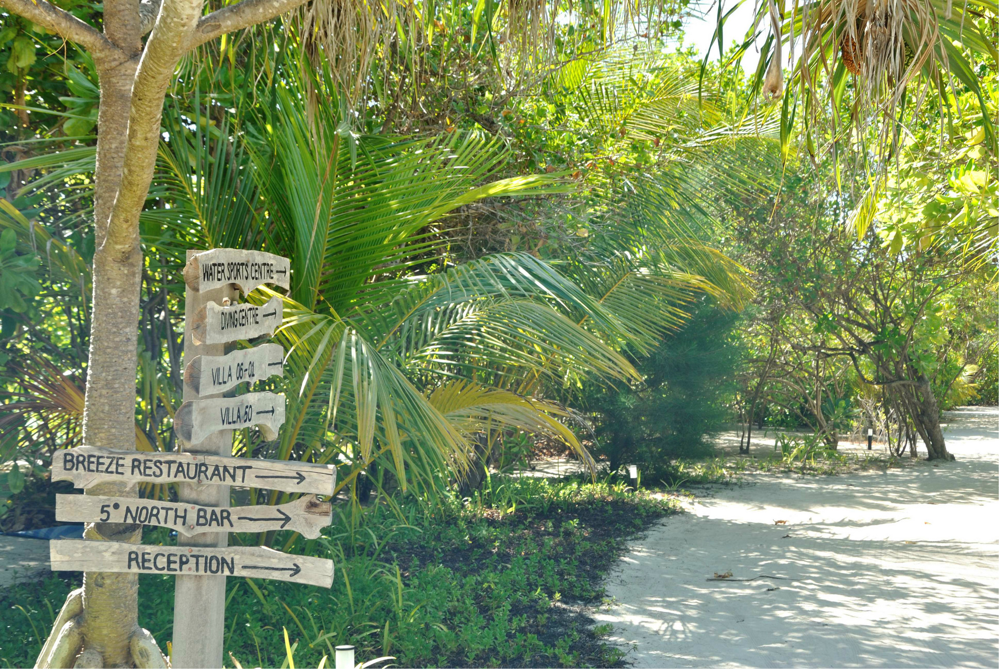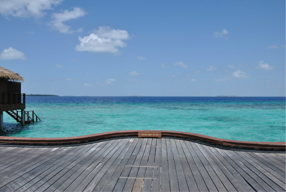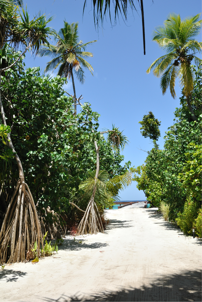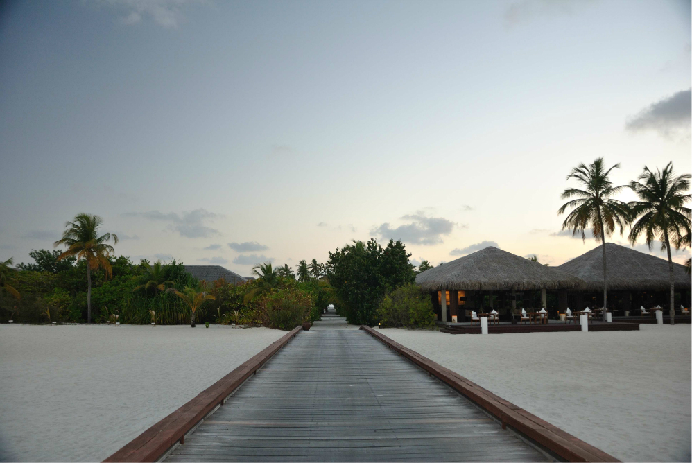 中轴风景,暂且这么称呼吧,其实就是从上岛开始的那条栈道开始,直接连接到整个岛的主通道 ,然后通向岛后面单排水屋的那条主干道。从这头走到那头的话,估计也就10来分钟,岛上的沙非常的细,很多老外在岛上都不穿鞋子,就连吃饭也是光着脚丫子走过的,可见这沙不但细而且没有杂质,不扎脚。