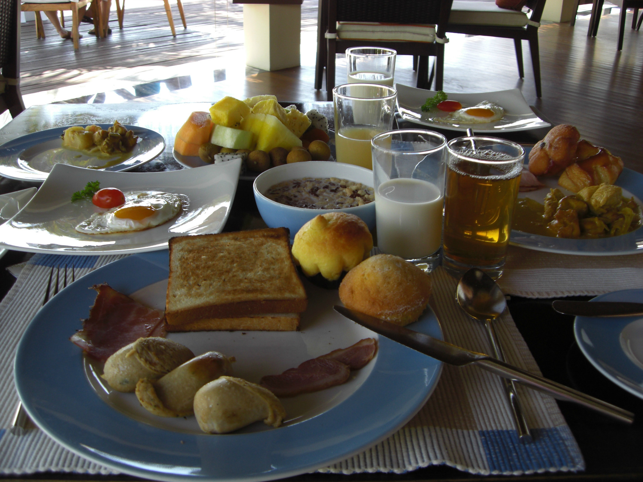 每天都是牛奶,果汁,香肠,培根,肉片,水果。。。吃到撑~