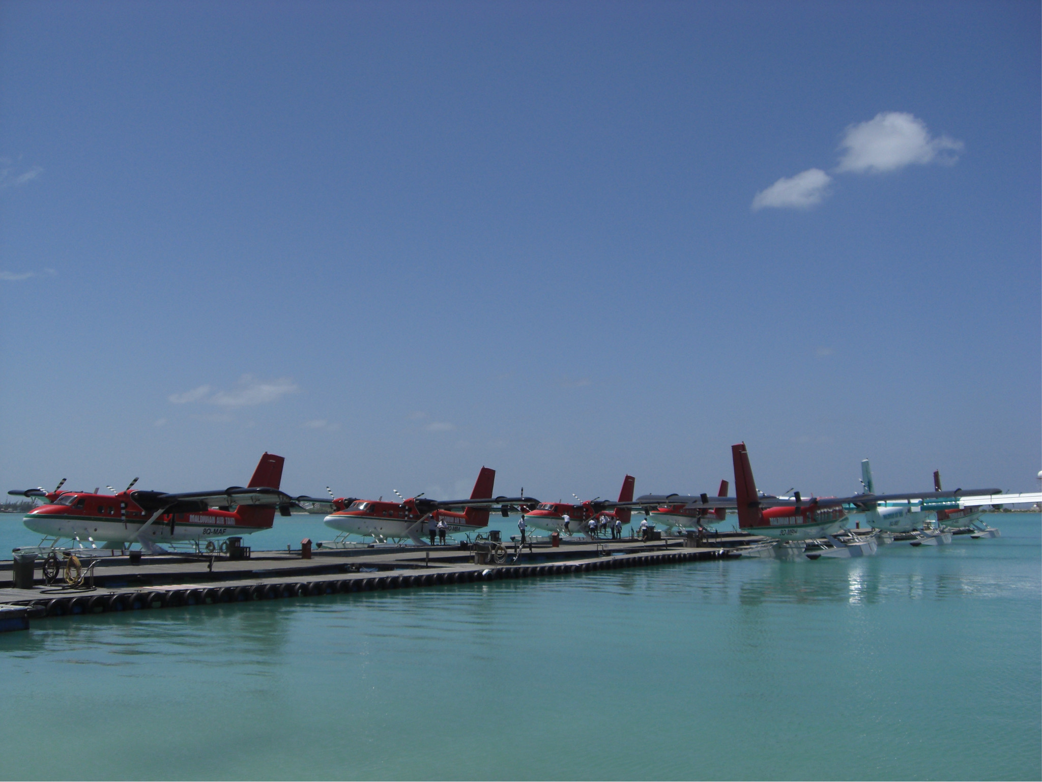 等了10来分钟,笔记本电脑才打开,就通知我们可以上灰机了,哎~果汁才喝了2口~可惜了。拐了个弯眼前就出现了这些个壮观场面,好多架水上 飞机~