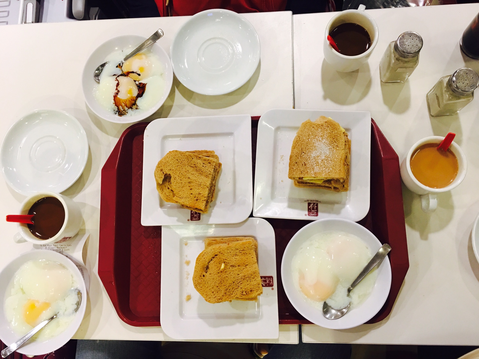 出关第一件事找吃的,立马来到传说中新加坡国民早餐—亚坤。点了三种套餐,咖椰酱、咖椰酱加花生酱、黄油加砂糖,咖椰酱口味最好吃,花生酱的很腻,黄油加砂糖感觉就是普通的港式,推荐去吃的就点A套餐。鸡蛋可以在白煮蛋和温泉蛋之间二选一,我们选择了温泉蛋,淋上酱油特别好吃,饮品选择咖啡or奶茶二。可惜的是我们三个人整个被花生酱给腻到难受了一上午