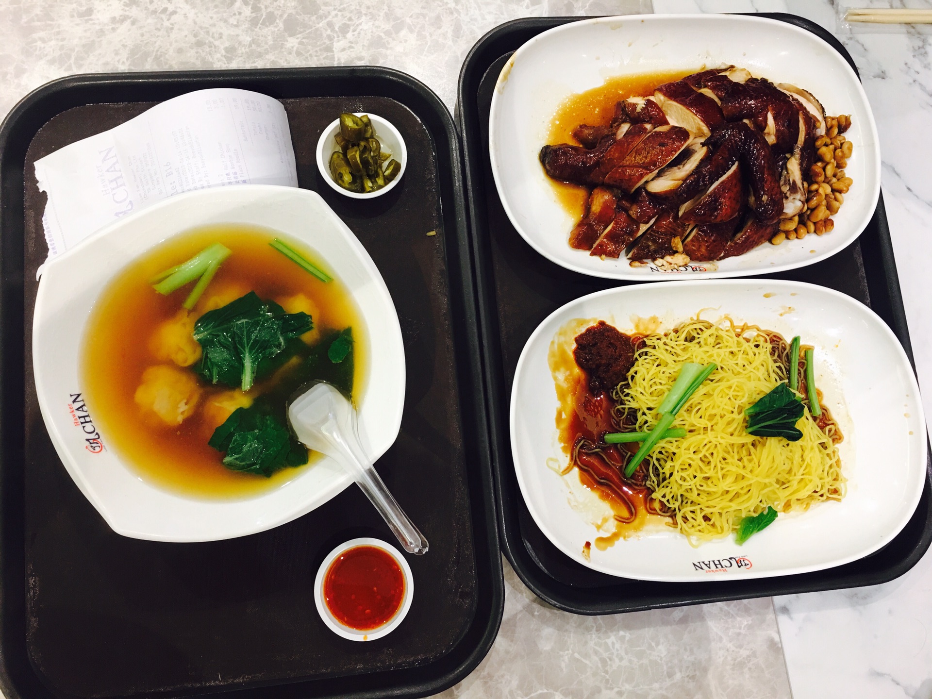 吃完天天海南鸡,一路走到唐人街牛车水美食街刷一顿米其林一星餐厅—了凡油鸡饭,由于前面吃过饭了这次就点了半只油鸡加一碗面和一碗云吞,同样推荐分开点肉会多。油鸡很不错但我觉得表皮没有想象中的脆,个人很喜欢拌了虾酱的面,云吞我已经没有什么口味印象了