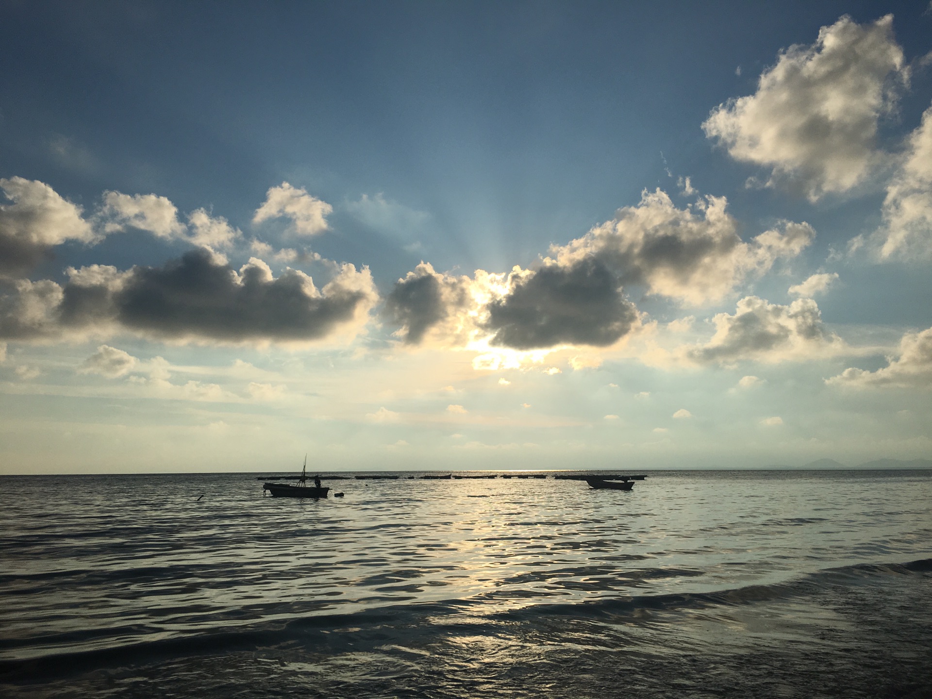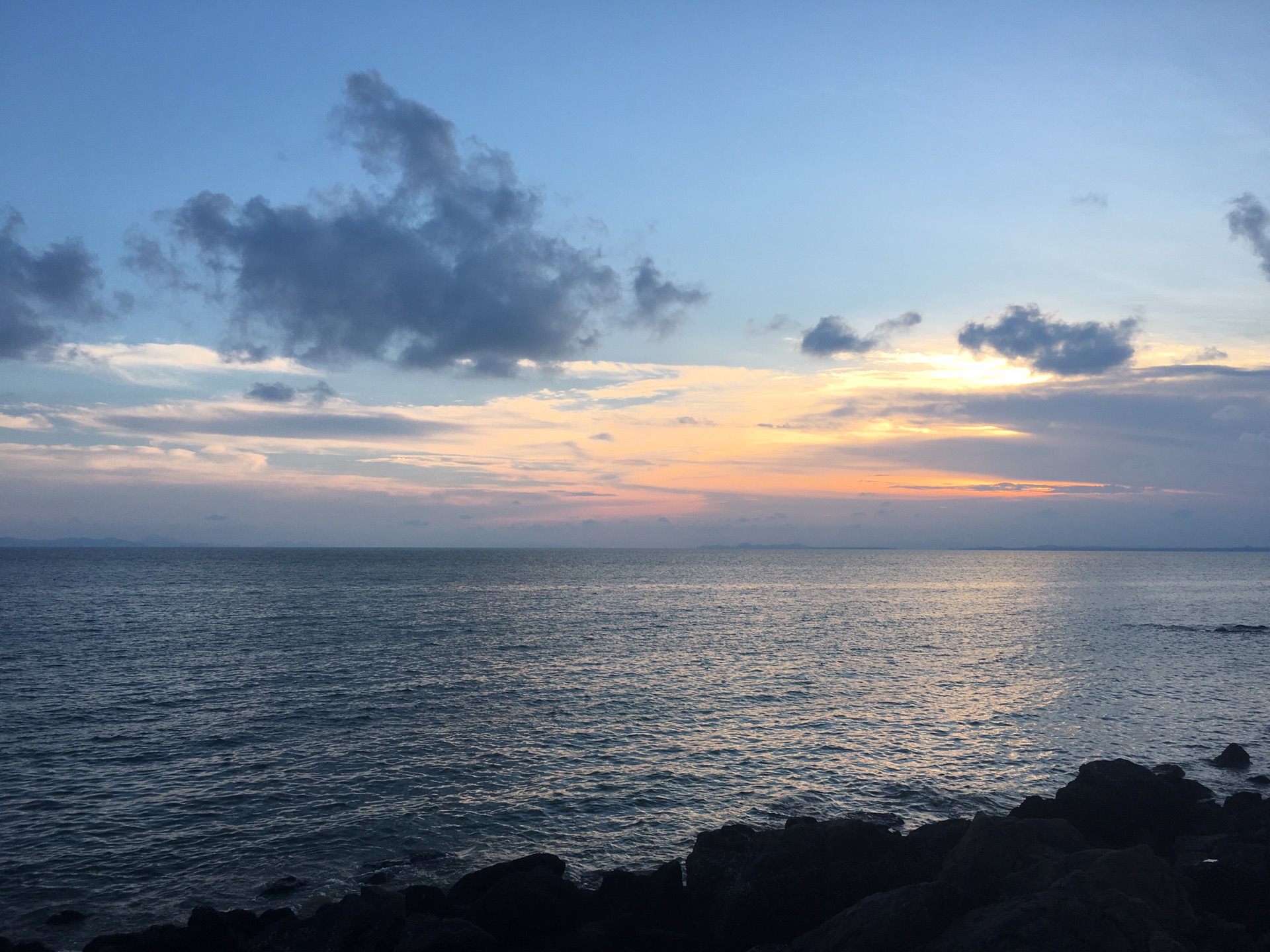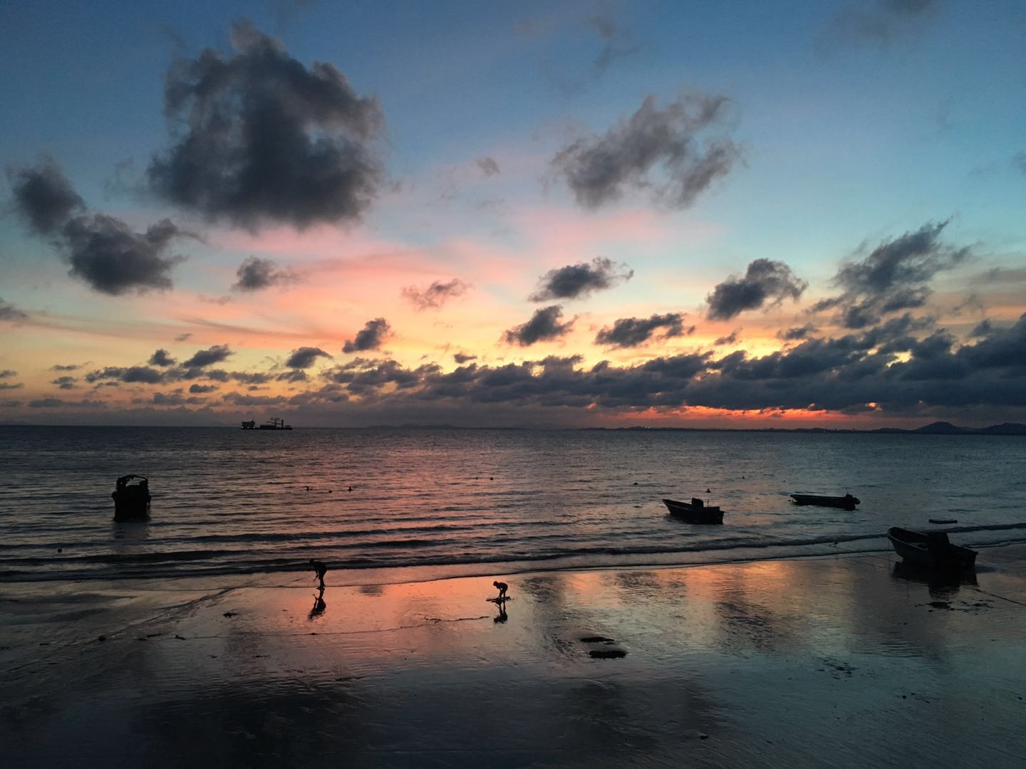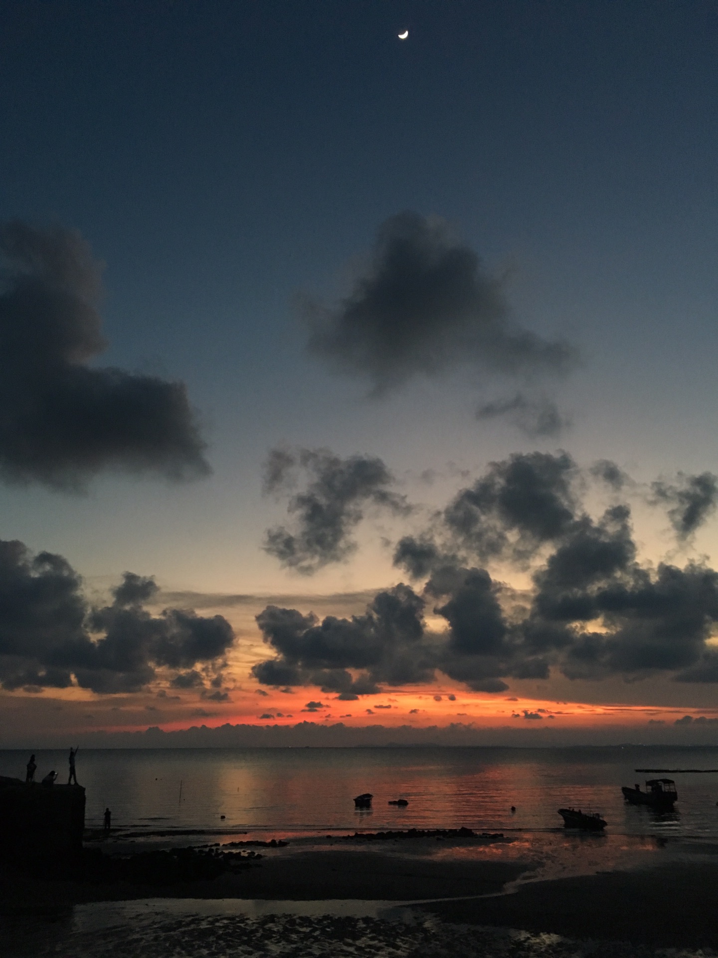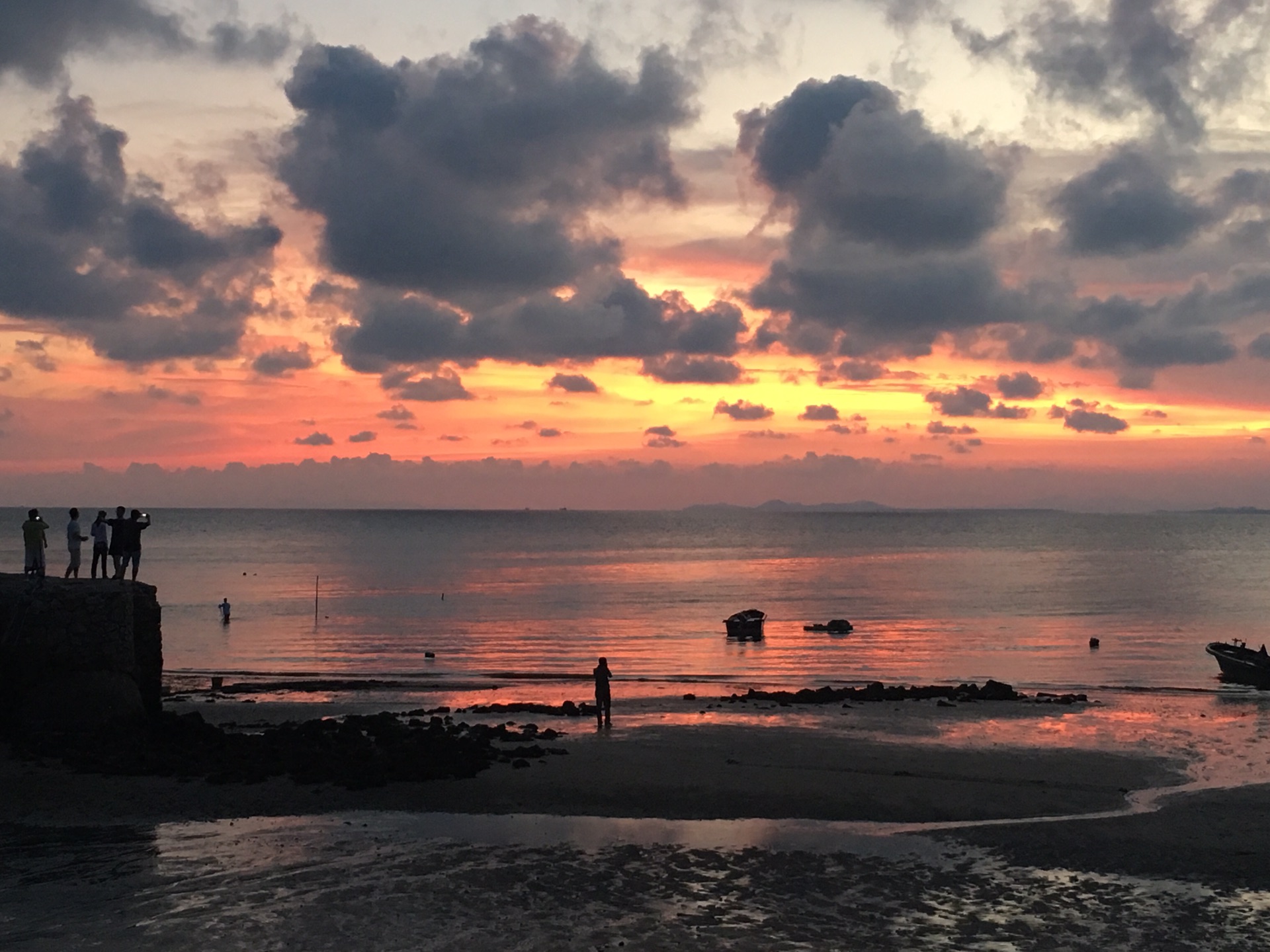 日落将天空和整片沙滩染得通红,我用照片记录下整个过程。当然,这样做的不只是我,还有人专门带了单反支起脚架各种拍。太阳没落,明月挂空,岸边依然有不少人欣赏着如此美景,迟迟没去吃饭。
