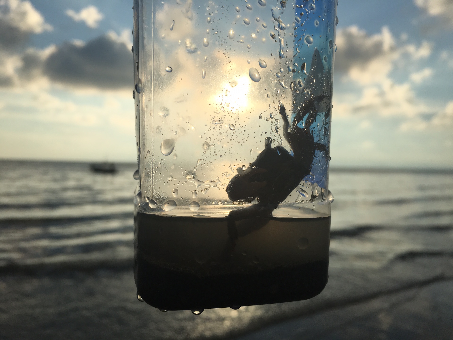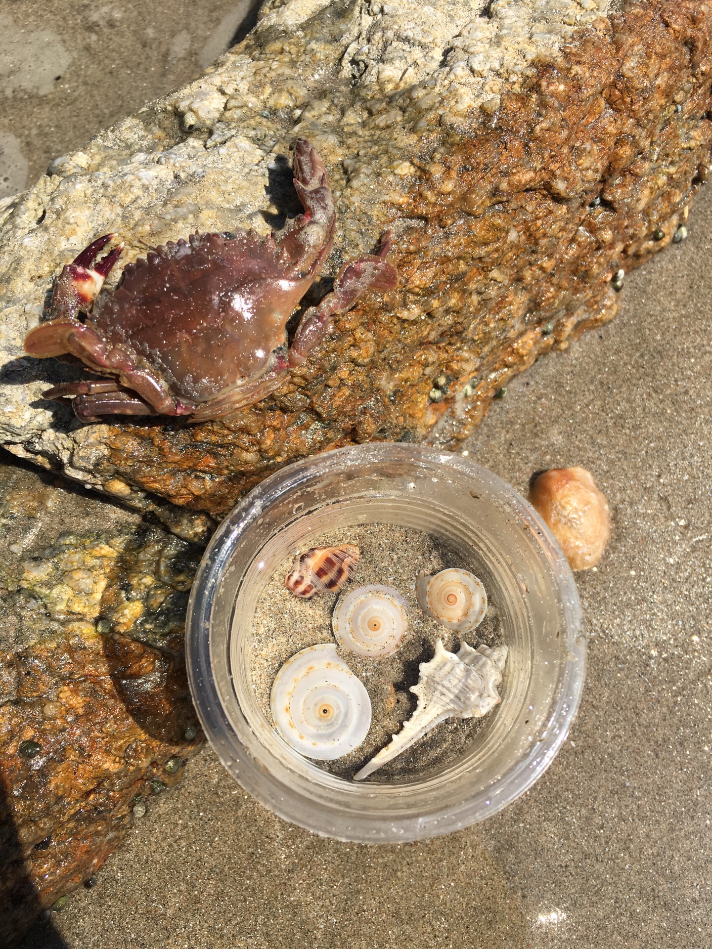 珍珠湾的沙细腻白净,沙滩上的贝壳真不少。背着毒辣的太阳,一路踏水,捡到的贝壳越来越多。还发现五颜六色的活贝,会随着浪花不停挪动,数量惊人。于是我用昨晚捡来的小胶盘,加上剩下的活鱼蟹,和现捞的各色活贝和贝壳,布置起自己的海洋世界。