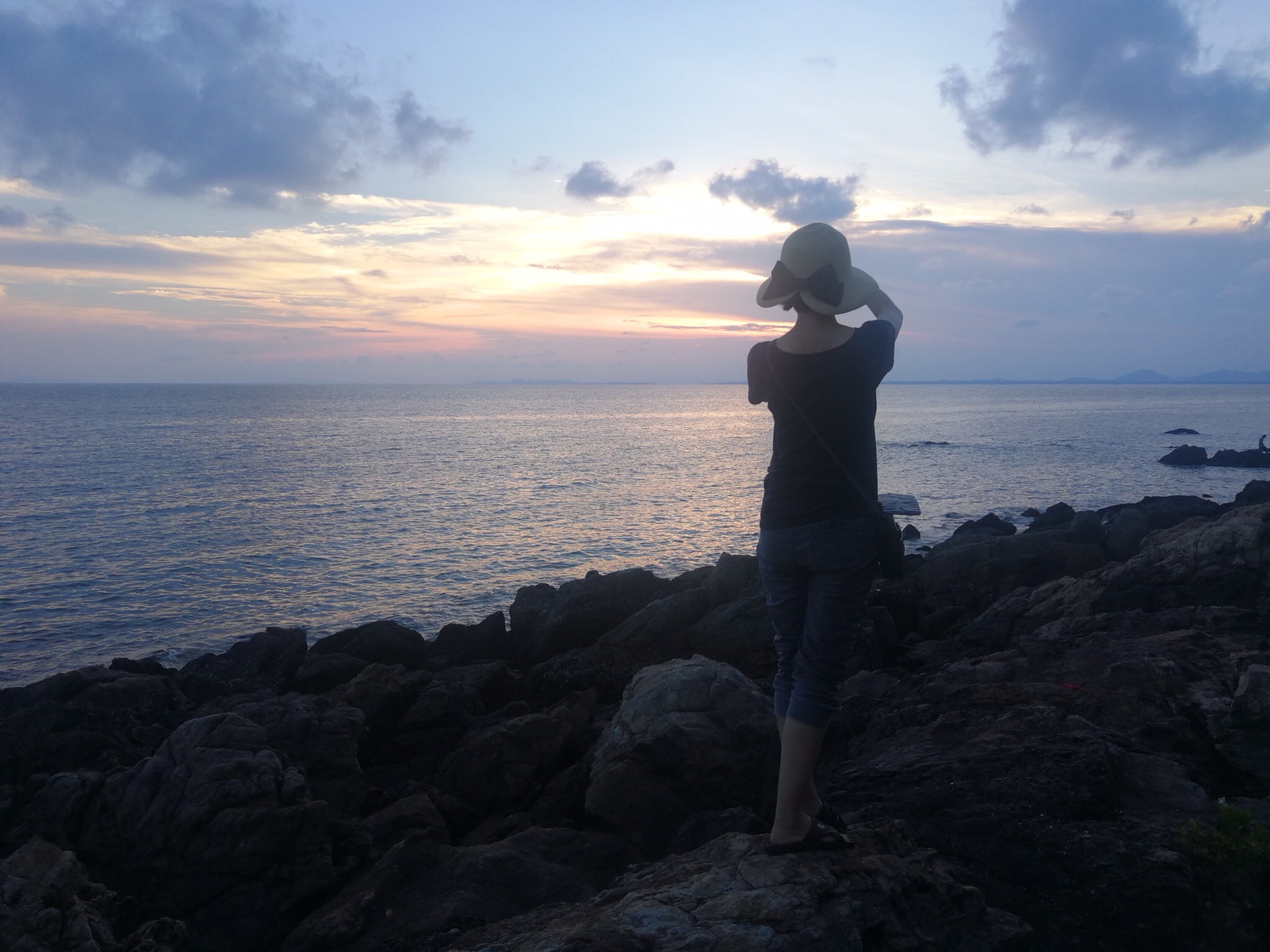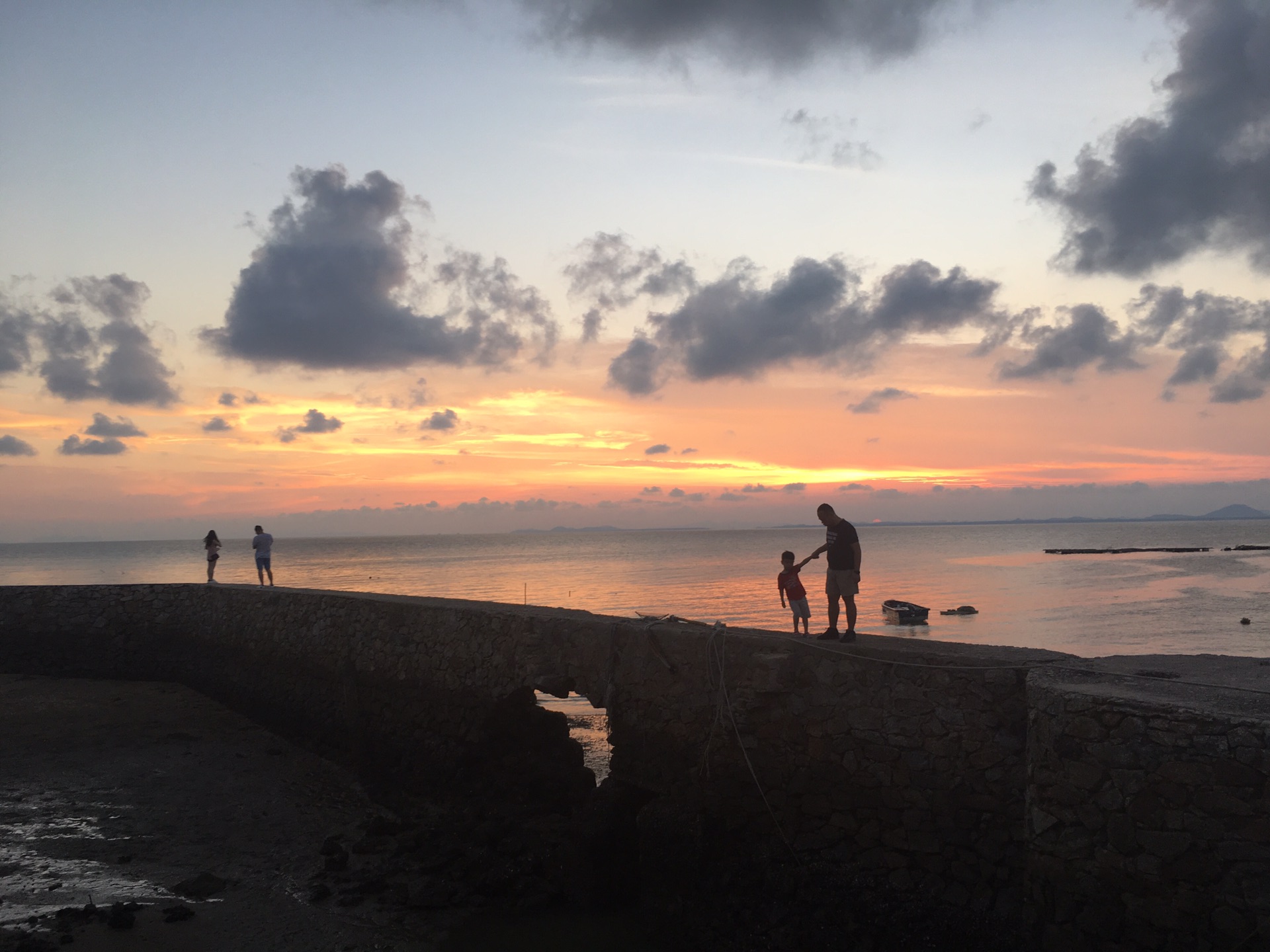 顺着日落的方向走,发现有几个年轻人熟练地攀过难走的岩石堆,到了远处的一个小海滩,戴着手套不停弯身拣东西。后来猜对他们是在抓蟹,估计是能拿起卖的大小。
