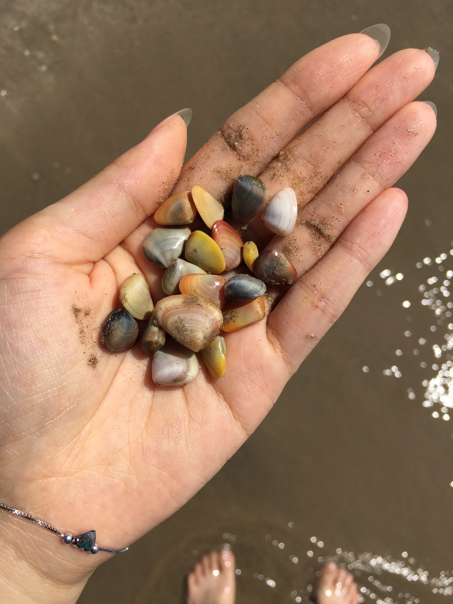 第二天早上九点多,我们带上昨天的一盘“收获”退房后驱车前往珍珠湾,继续踏沙捡贝壳。