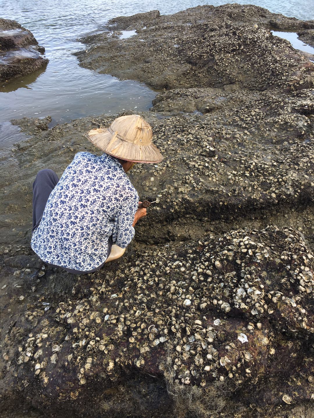 有不少当地人四点钟就开始抡起自制的犁耕用具扒沙。走近一看,原来在翻沙挖蚬,好大一只肥肥的壳,十元一斤。还有好多小蟹藏在岩石堆,抓蟹也是一大乐趣。