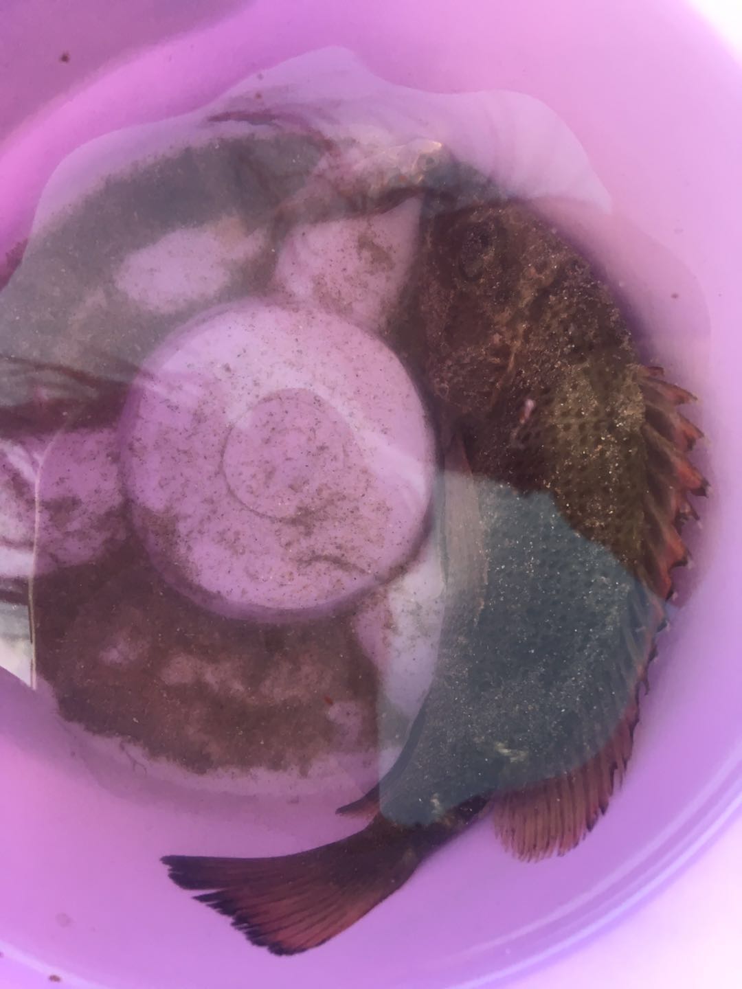 而收获吧,礁石缝意外得到一条被渔网困住的大鱼,不知道是什么鱼,百度了一下有点像石斑。