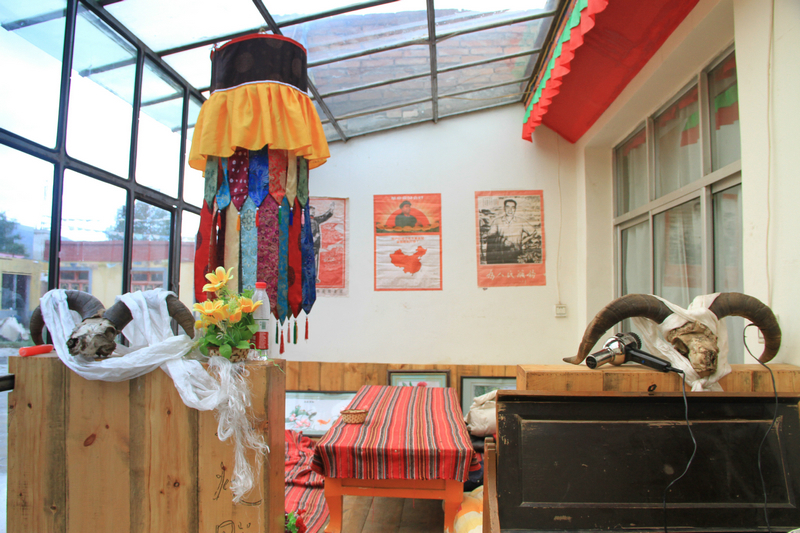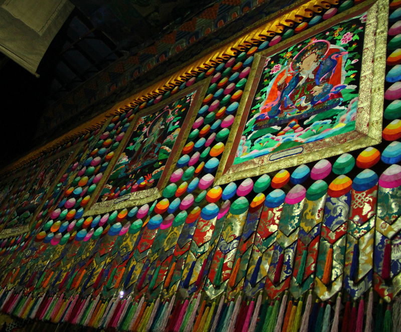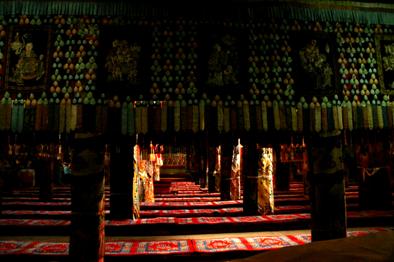 经院里。上面悬挂的是有着立体唐卡之称的堆绣,创于塔尔寺。经院内禁止拍照,我违规了。喇嘛们就是在这里诵经学佛。