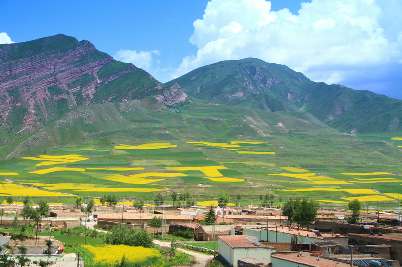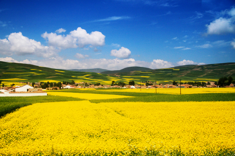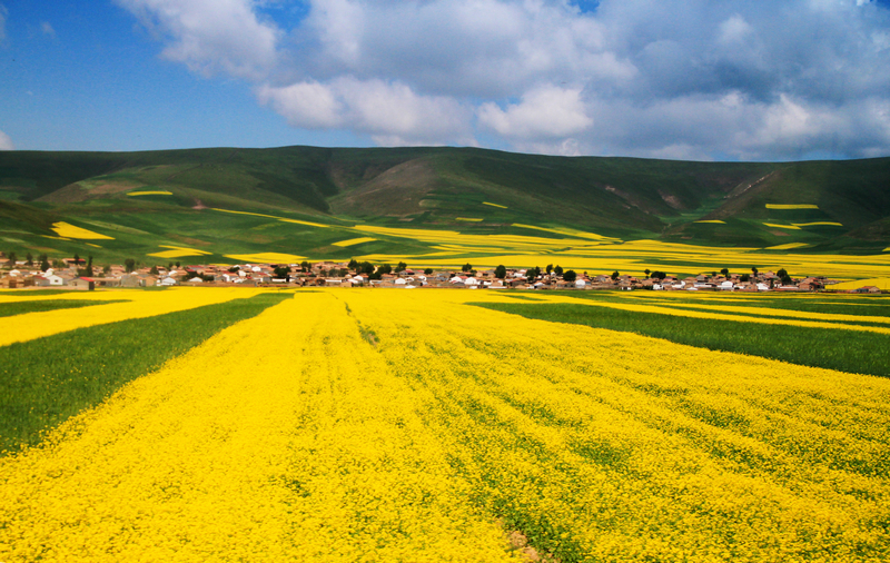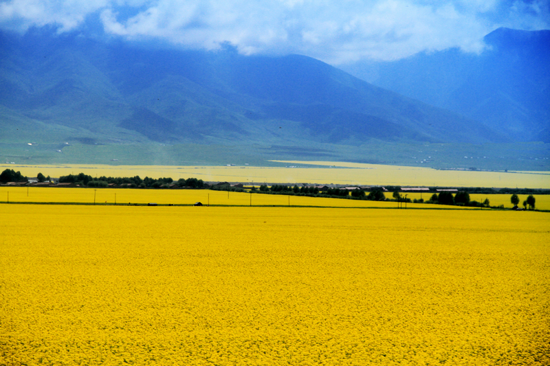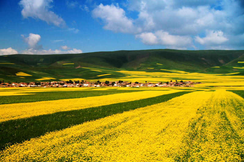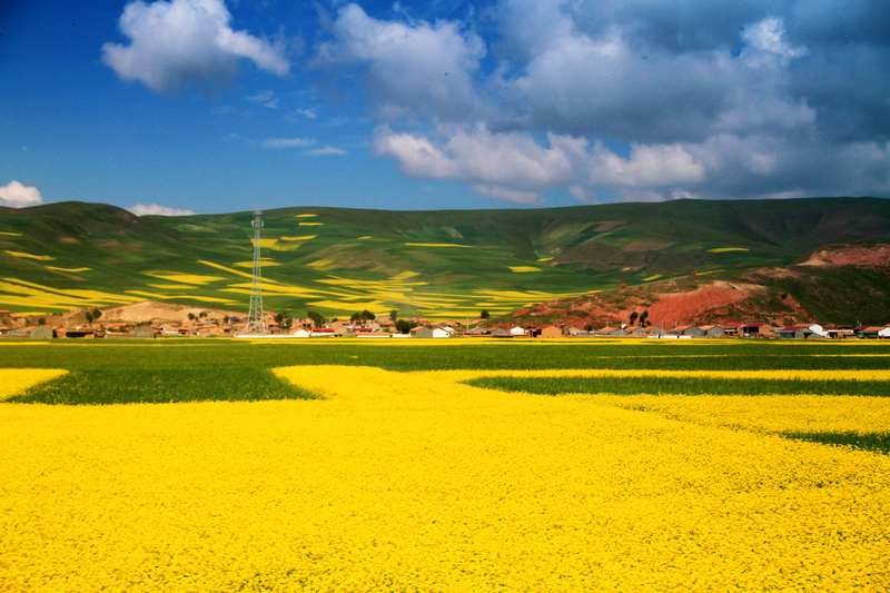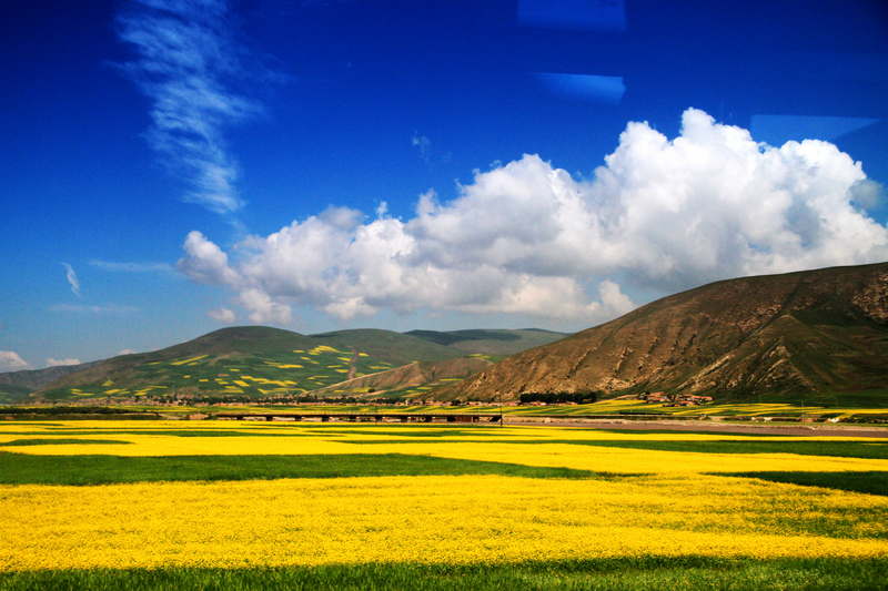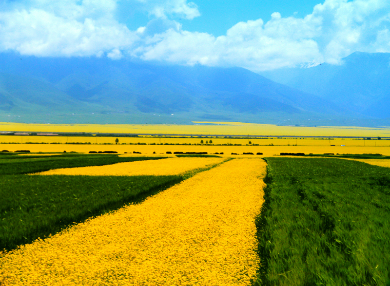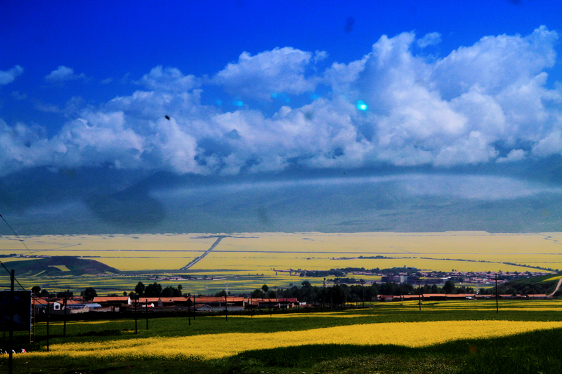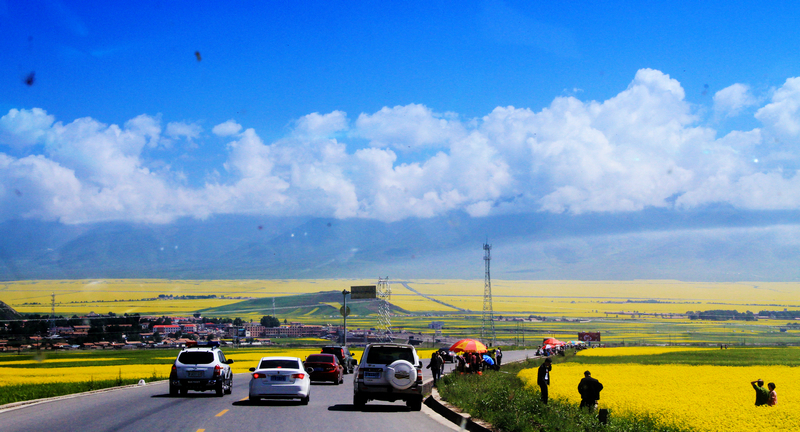 西北 的路似乎都不超过四车道,即使是高速公路。上祁连山 前,居然在一个小镇上堵车了。司机说,油菜花开了,大家都自驾游到门源 看油菜花。门源 油菜花,应该不用我多介绍了吧。与水墨婺源 的秀气不同,以祁连山 为背景的门源 油菜花海,有着一种无懈可击的霸气,壮阔,震撼。由于在青海湖 已经近距离接触了油菜花,所以我的行程里并没有安排门源 这一站,只是沿途观赏。以万亩花田,迎接一场青春盛宴。赏花的人实在太多了,游人不顾一切地把车停在路边然后疯狂拍照,轻而易举地把本来就窄小的盘山 公路包围了。大巴车上的我们,从俯瞰到穿越,油菜花田始终存在于我的视线。司机说,GOV为了色彩映衬,把门源 花海里村落的房子都刷成白墙红顶。
