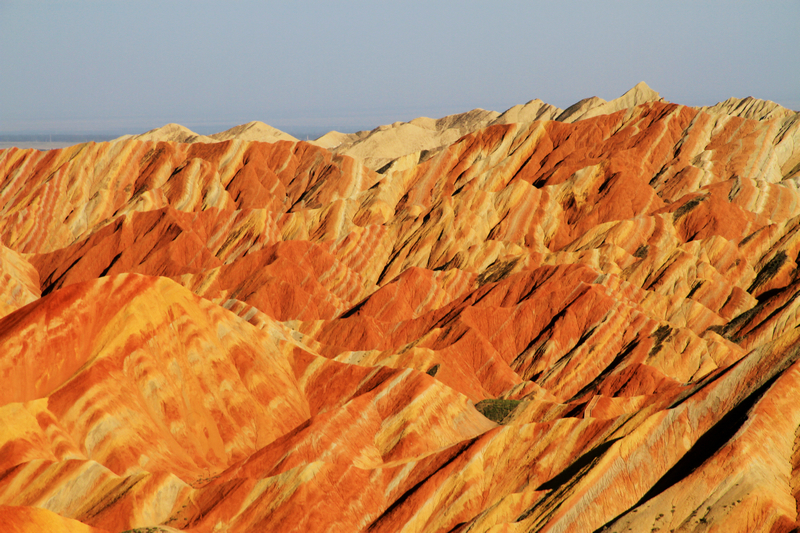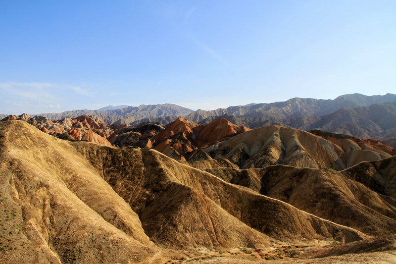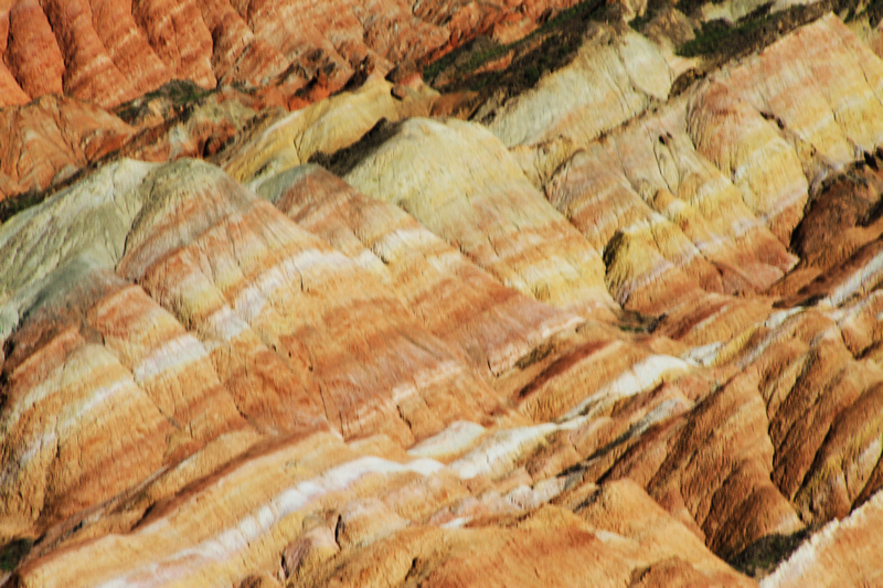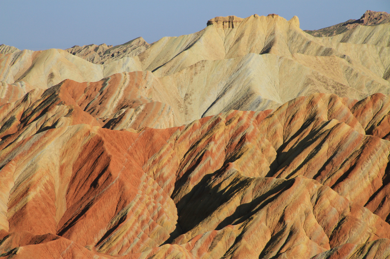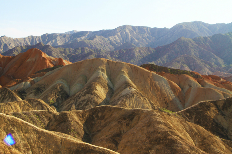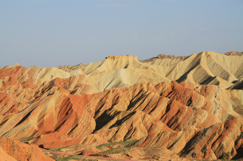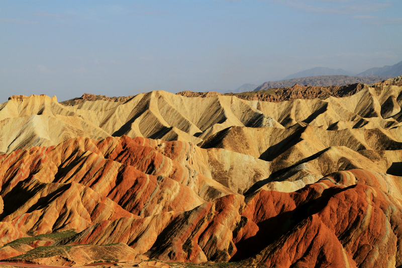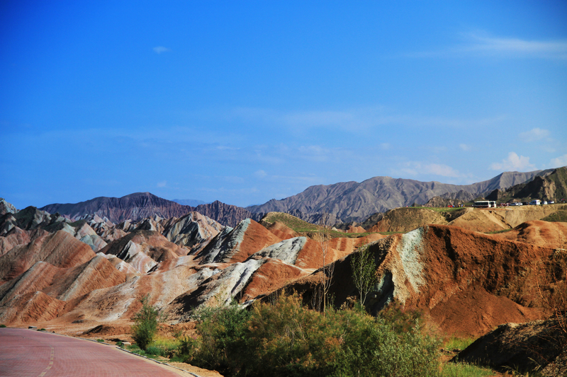 到达张掖 时已是下午两点。在车站附近吃过午饭,就和约定的包车师傅会合,前往丹霞山。李师傅说:“张掖 的丹霞和你们广东 的那个丹霞山不一样。你们的那个丹霞啊,只有丹,没有霞,看造型。我们这个看色彩。”李师傅说,丹霞最好看的是日出。我们出发时间是下午四点,早了。而日落在8点半。丹霞山的门票,是目前我们购买的第一张门票,原价40元。游览丹霞山需要乘坐景区的汽车,20元没人。这是一个性价比很高很高的景点。丹霞山绵延500公里,目前开发的只有50公里,横跨临泽 县(我们去的)和肃南 县。当年张艺谋在拍摄《三枪》时,曾在丹霞山取景。从此丹霞山一炮而红。我不知道丹霞地貌的成因,也懒得去百度。年年岁岁的风雨以及各种矿物质,发育了这片浑厚壮阔的七彩丘陵。飞扬跋扈的色彩就这么闯入我的旅途,毫不夸张地说,这样的七彩丹霞是上帝的调色盘。游览了2小时,发现很多摄影师架好三脚架在等日落。我担心李师傅等太久,就早早地出来了