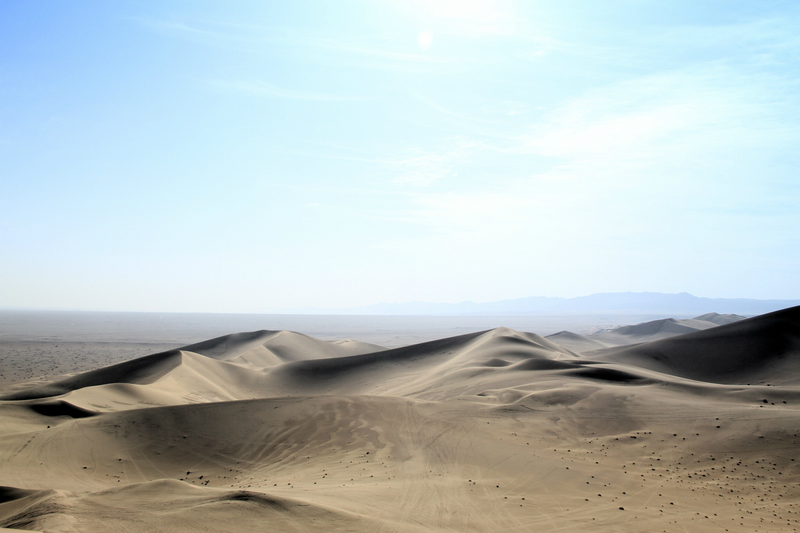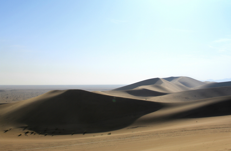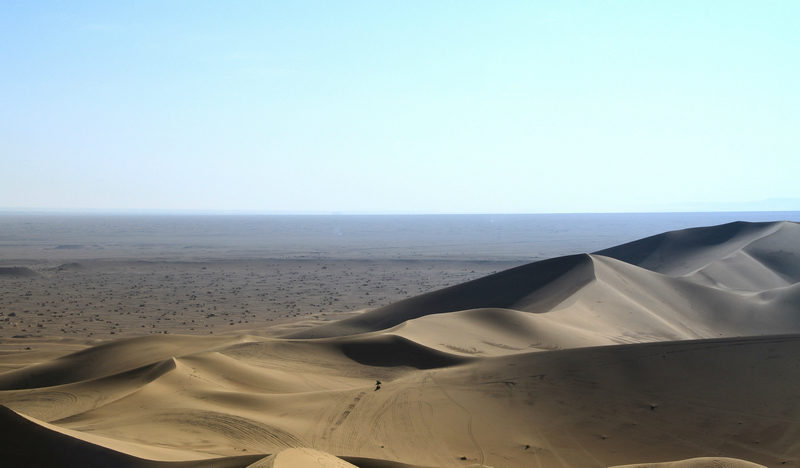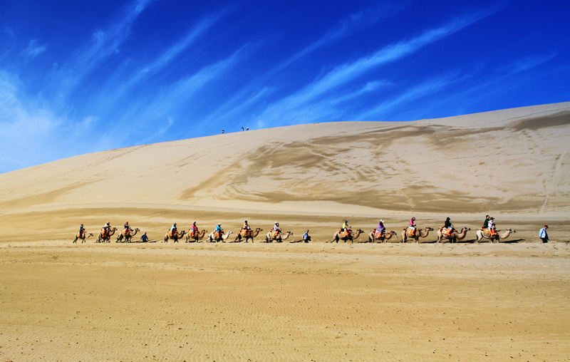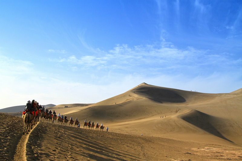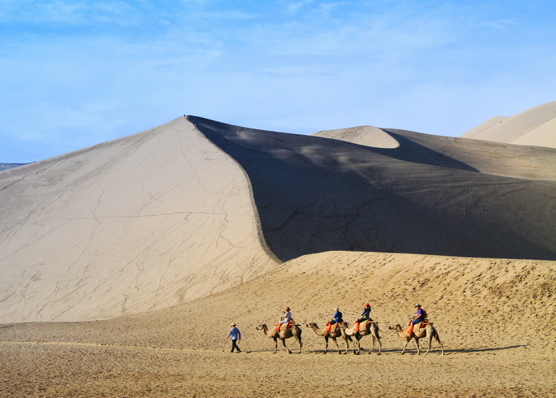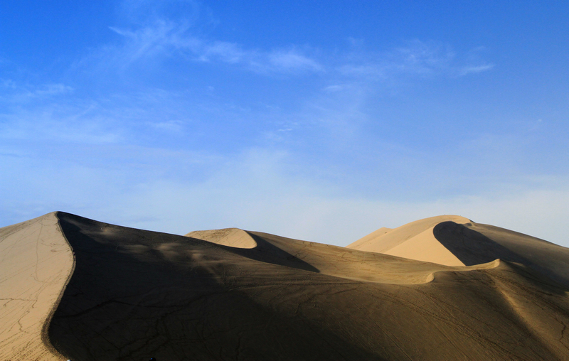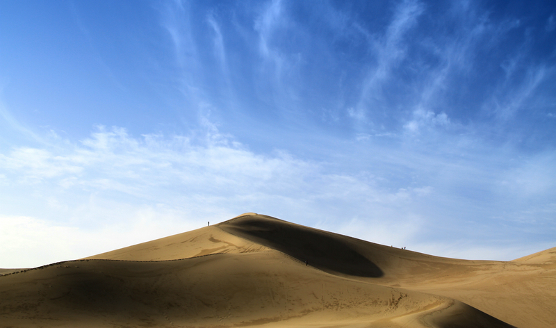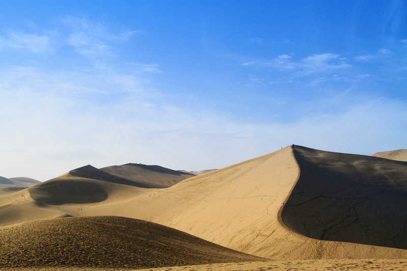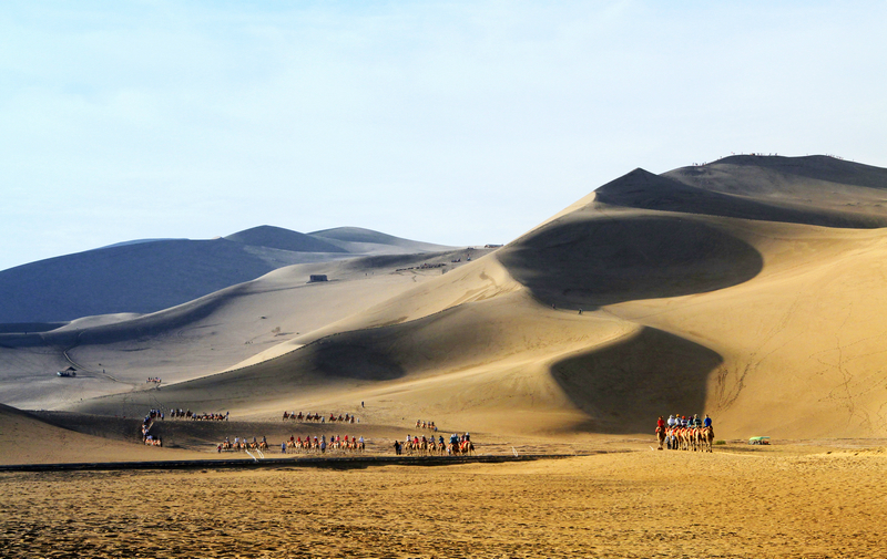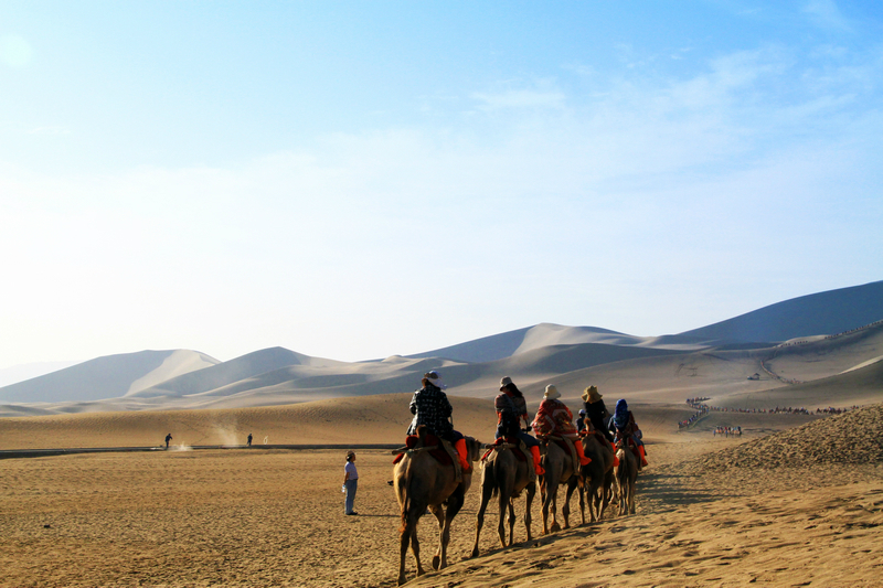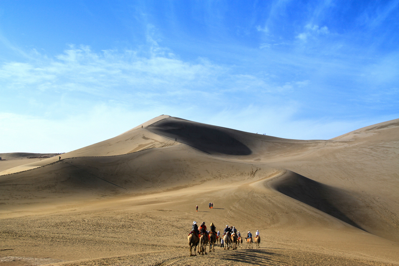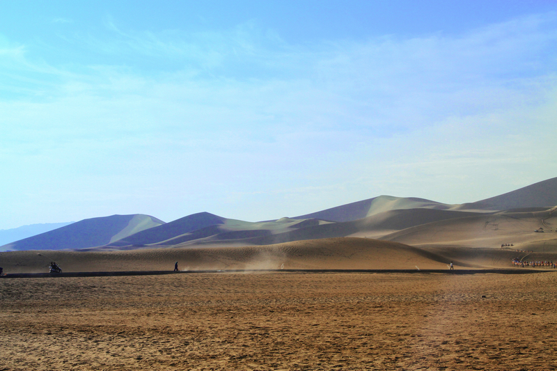 上午8点,拼车到达鸣沙山。鸣沙山,是我踏足的第一个沙漠。清晨的鸣沙山阳 光还很柔软,沙子不滚烫,天空依旧湛蓝,但游客已经熙攘。