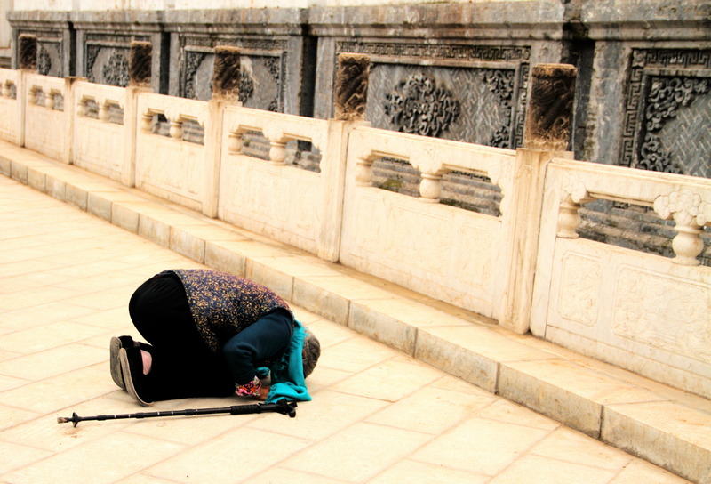 【在寺庙的廊道下,在拥挤的游客旁,我终于发现了他们——磕长头的朝圣者】