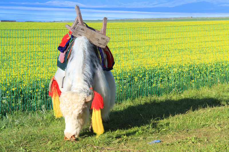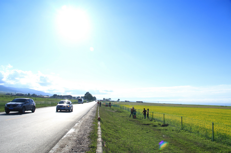 对于一般的旅行团,他们去青海湖 是指青海湖 151景区,门票100。去过的网友纷纷表示,如非乘船游湖,完全没有必要买门票进去。偌大的青海湖 ,除了旅游公司开发的景区,藏民也开辟了小路从公路到湖边,价格只需要5-30。因此,我们就没有到景区,而是听从扎西太太的建议,每人花了5元进入湖边。湖边离马路大概100米,夹杂种植着高原作物——青稞和油菜花。观赏油菜花是免费的,如果你不需要亲手触摸湖水,那5元也可以省掉。我们在当天下午并没有进湖边,只在路边观赏油菜花。在花海旁,三脚架长枪短跑比比皆是,目之所及,几乎都是单反。一位伯伯听到我帮妈妈拍照时喊“一二三”,听出了我的粤语,搭起话来。原来,他们是一个从上海 来的摄影团,已经等了一个下午了,才等到雨过天晴的时机。伯伯说,从西宁 到青海湖 的路上从右边窗户可以看到雪山。呀,我就是坐在右边窗户啊,居然错过了。但并不是所有事都错失了就无法追及,我还有回程。