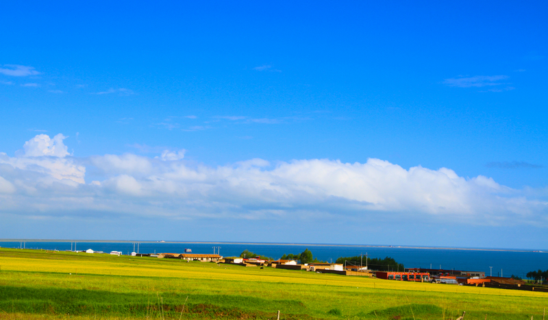 我祈祷,快快放晴吧,给我一个天天天蓝的青海湖 。行车3小时后,终于看到青海湖 的端倪,在那黑压压的云下。当我下车时,雨已经停了,云正慢慢散去。我和妈妈站在公路边,左边是扎西青年旅舍的指示牌,右边是黄花碧海绿草白羊。青海湖 ,到了。这里有海子所描述的一切,也是仓央嘉措的长眠之地。