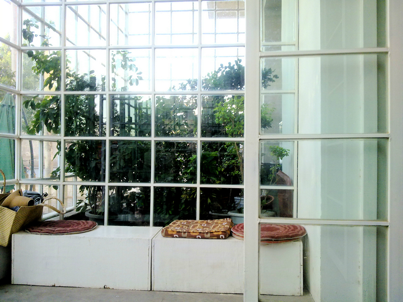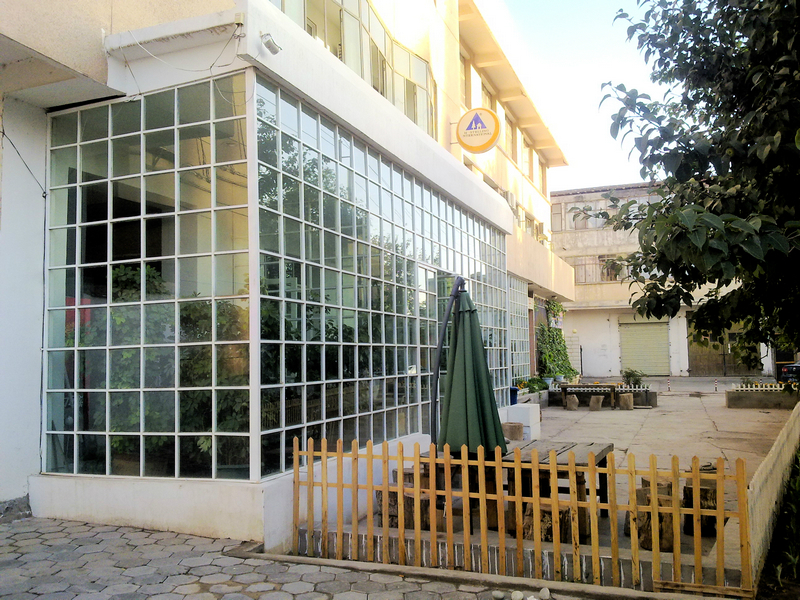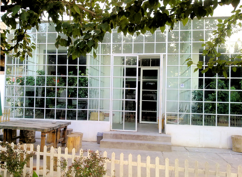 出了火车站,坐专线公交到敦煌 市区。在公车上,居然遇到了蚂蜂窝的网友,他们手上拿着蚂蜂窝的旗帜,他们中的其中的一位是广东 同乡,闲聊了几句就各自回旅舍了。我们在敦煌 住国际青旅,一栋很温馨的玻璃房。玻璃房很有feel, 有一隅花房,有一角书吧,有一方休闲之地。玻璃房总共四层楼,我们住四楼的双人房。四楼有一个大大的露台,摆放着八个帐篷。掌柜说,很多人喜欢住帐篷,在天台 数星星谈天说地。敦煌 的繁星我也在这个天台 上见识到了,和青海湖 一样,这里也可以看到勺子状的北斗 七星。掌柜说,如果在鸣沙山露营,还可以看到银河。