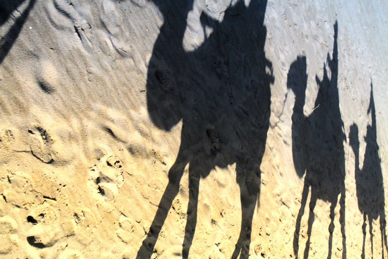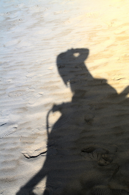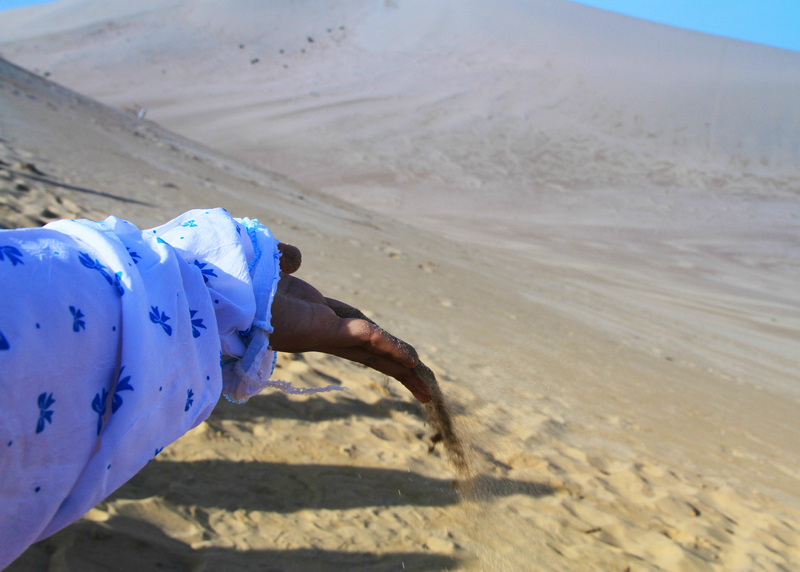 骆驼不紧不慢地走着,慵懒的颠簸后,我来到了一条栈道旁。我要沿着栈道爬上山顶,然后滑沙下来。栈道并不容易走,木块陷入沙子里,手脚并用才爬上了沙丘的顶部。然后,我用了15秒就滑了下来。手掌与沙子摩擦后泛红了,抓起一把沙子,看着它们从指缝中溜走,穿着鞋套的脚踏不出完美的脚印。