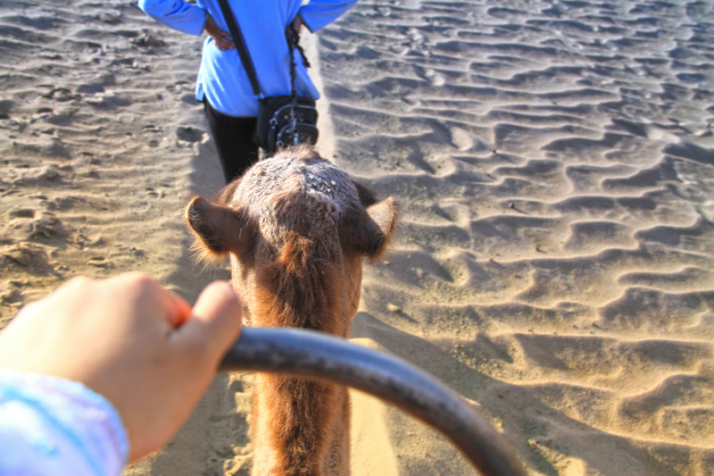 在入门处租了一双鞋套,买了骑骆驼的票,在驼队里等待出发。很遗憾地,我和妈妈分开了两个骆驼队,她的队伍先出发了。骆驼是属于当地的家庭的,每个家庭拥有一支或数支驼队,每支驼队有5只骆驼。8点半左右,我的驼队出发了。