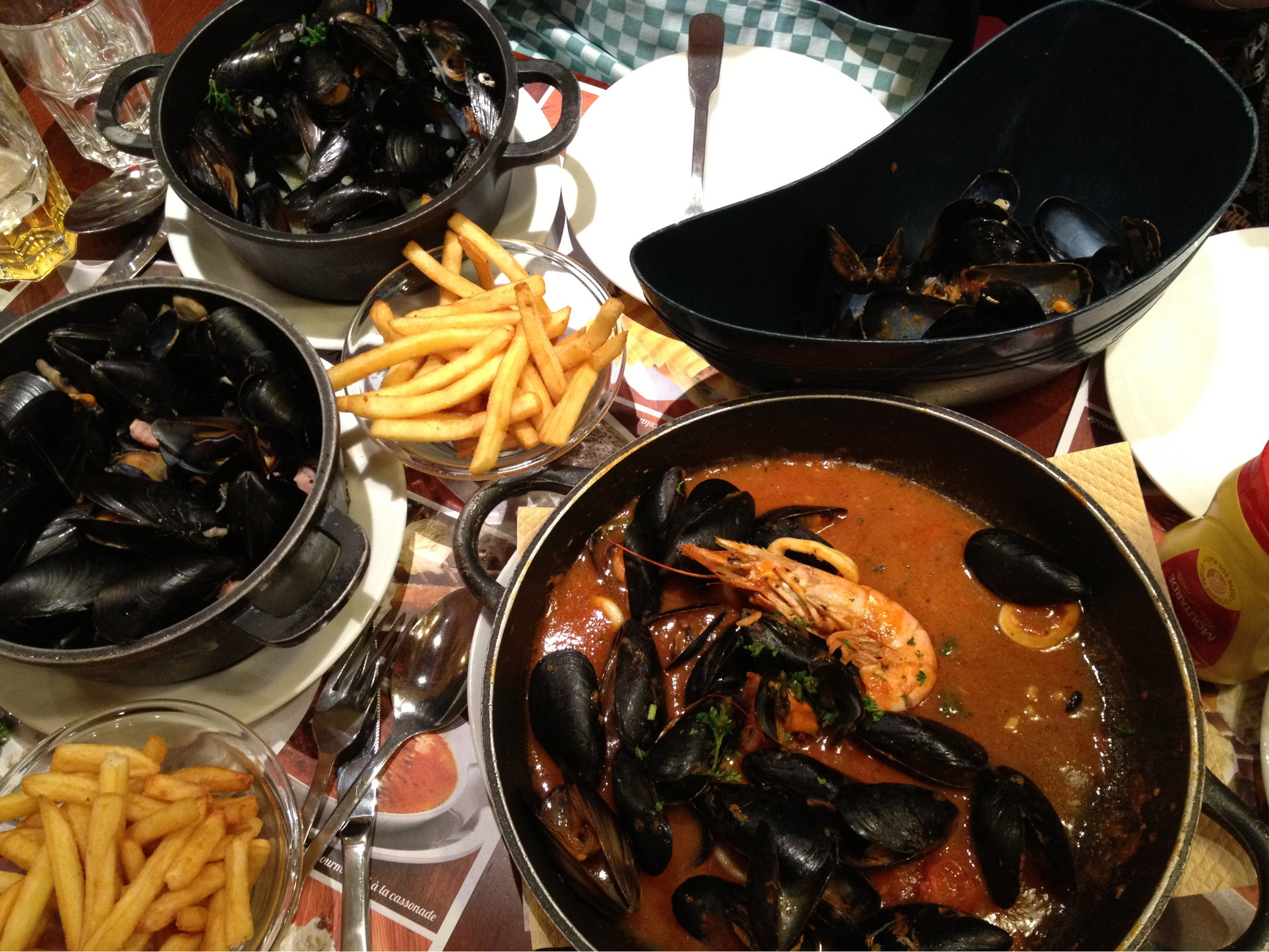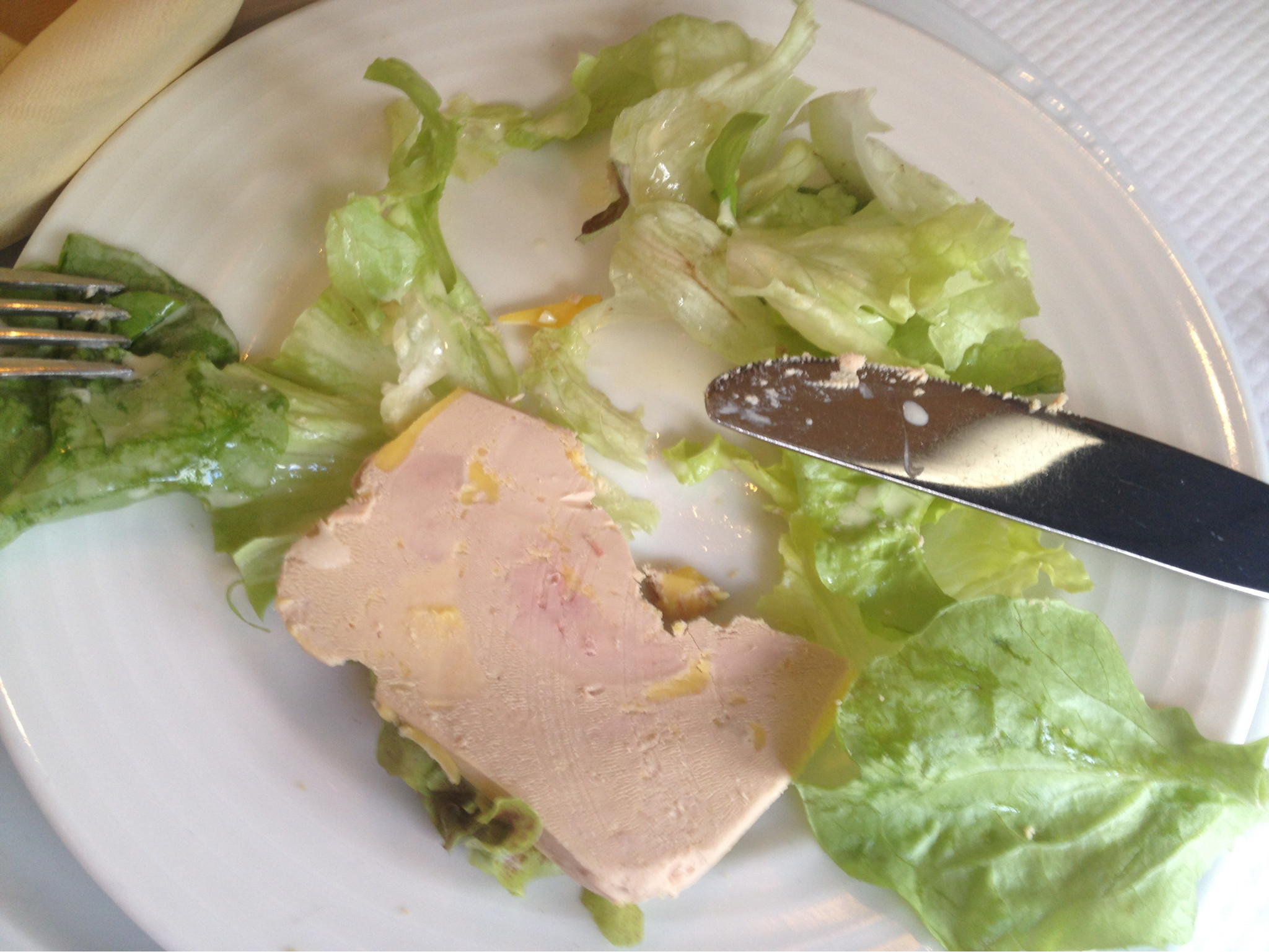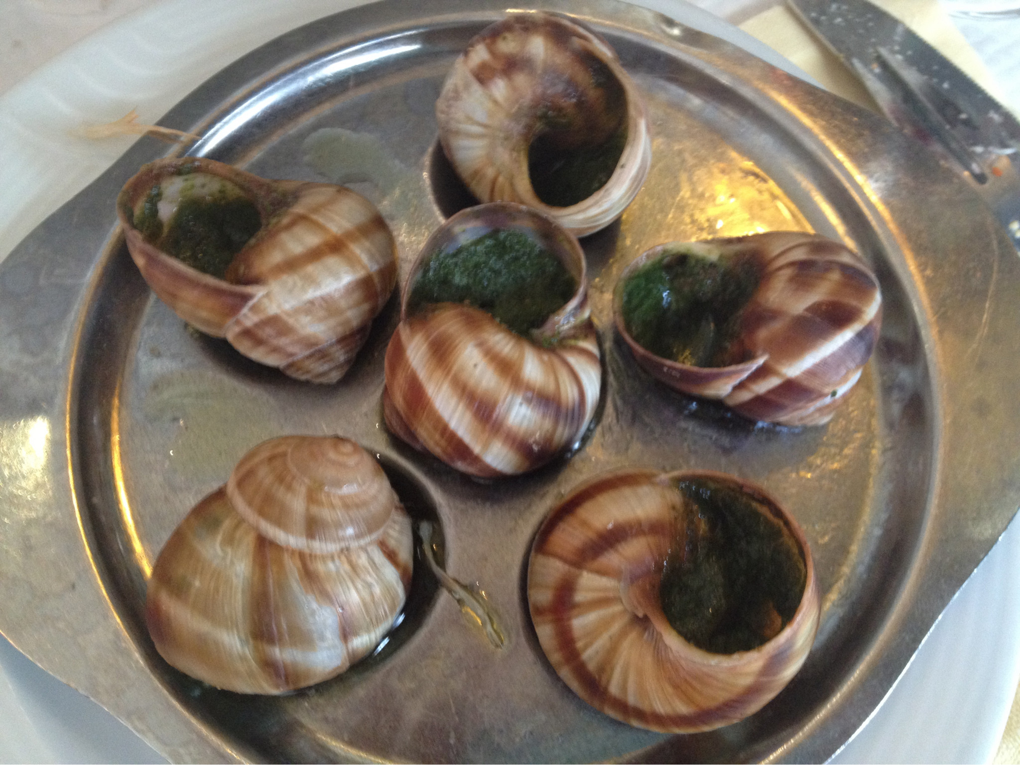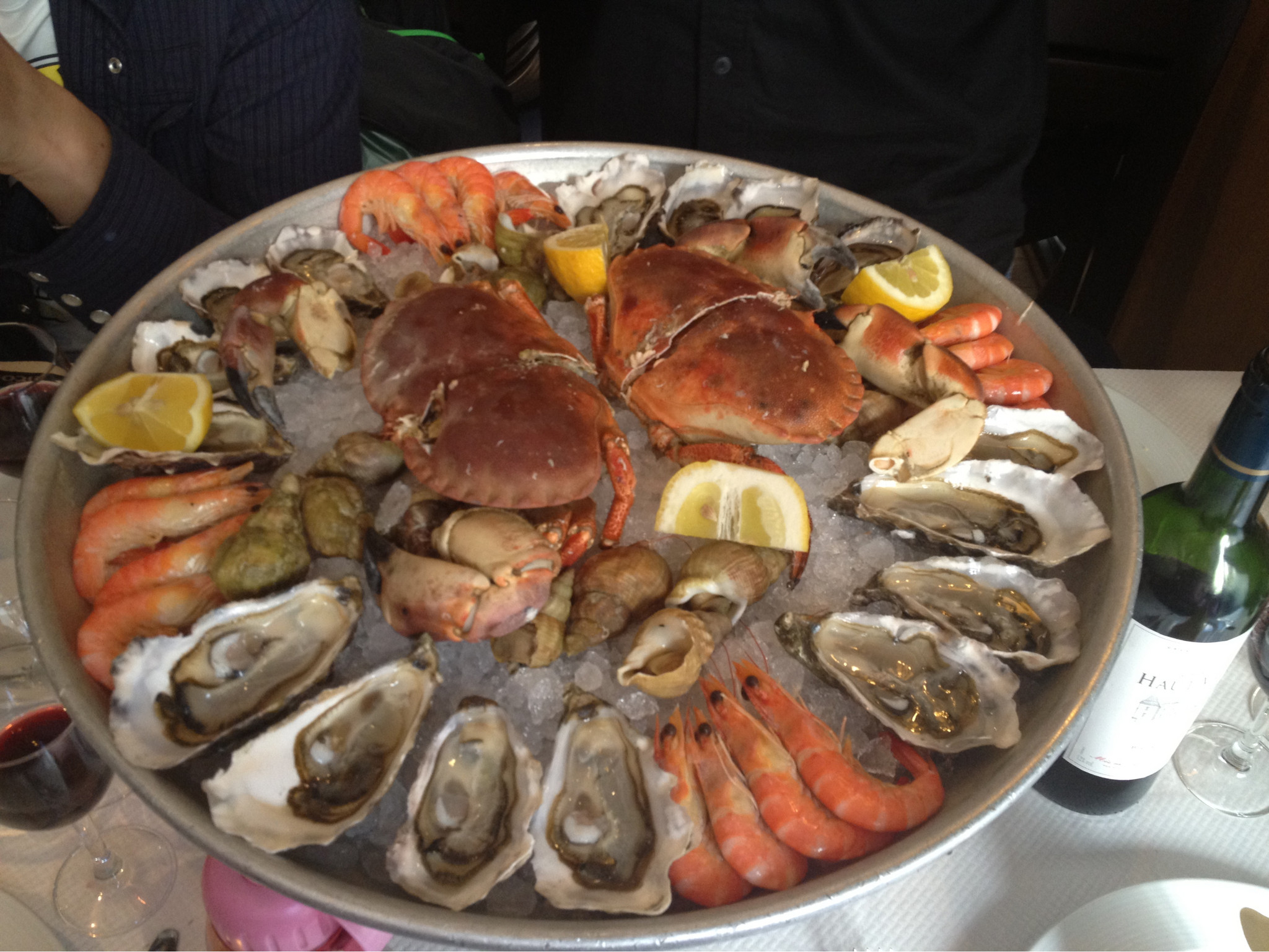 来点美食醒醒神。来到法国 ,一定要奔去吃一顿响当当的法国 大餐,多少钱我忘了问,我们是将所有自费项打包给导游的,反正其中的一分海鲜散卖的也要50欧。有我们的收入来比,贵是肯定的,但以人家的消费水平来说就比我们在国内消费还便宜呢。一个法国 大餐包括什么呢,面包若干,一份鹅肝酱,面包沾着鹅肝酱吃,我更喜欢将鹅肝酱放在嘴里吃,很香很滑,走之前就在老佛爷买了一些回去送亲朋。接下来上的依次有海鲜,一个大盘冰上放了四份,供四个人享用,每份有四个生蚝、四只虾、四个花螺、半只蟹,当然颇鲜美,还在一盘法式蜗牛,然后是鱼或者是牛排,我要了牛排,半生的很多血(茹毛饮血),最后是苹果披,红酒随意喝。味道很好,除了牛排剩了许多外,全歼!结果是撑得很厉害!分量十足,热量过剩啦!