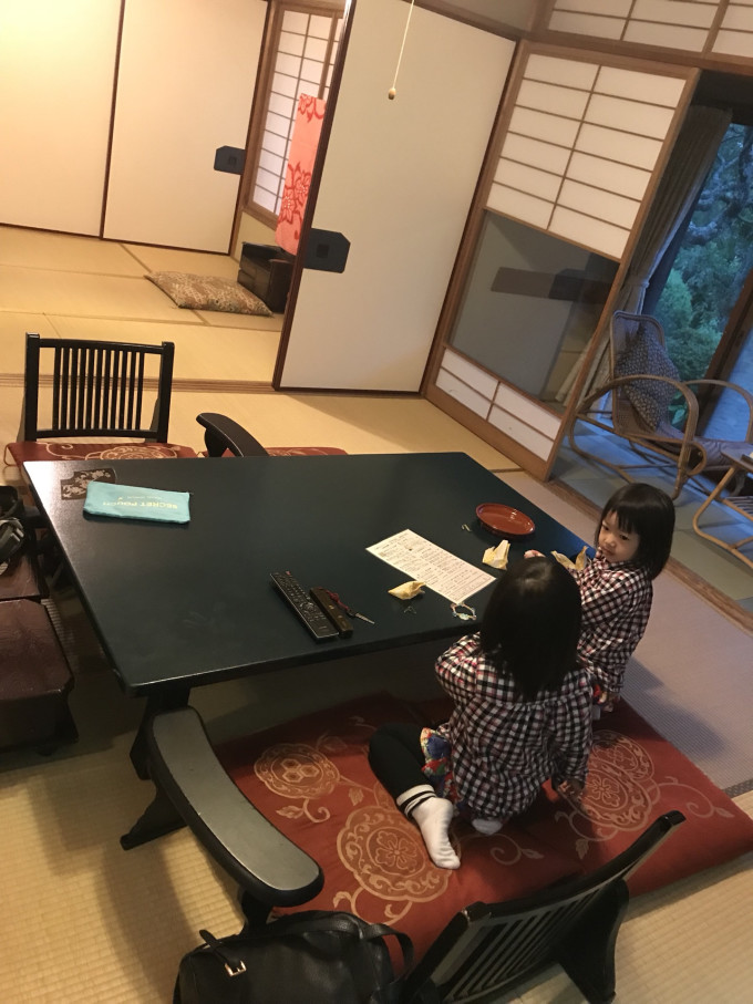 经过了历史悠久的松竹馆延山而上,到半山腰才到我们的小屋。古色古香的日式房间很宽敞,十来塌的房间让娃算是撒了花了