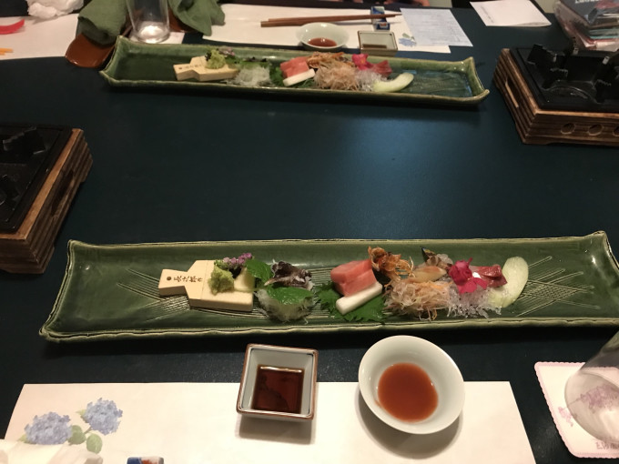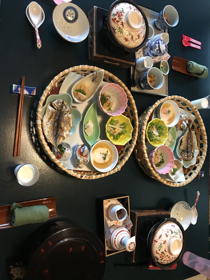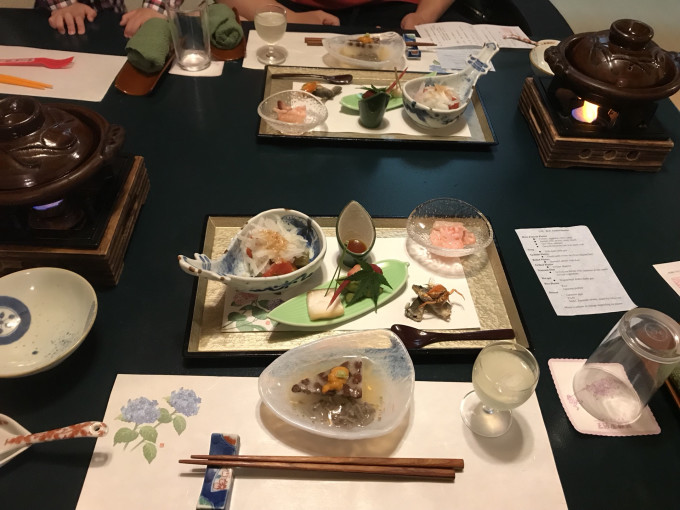 由于时间已经晚了,所以晚上的怀石料理也很快就开摆了。负责晚餐的阿姨年纪看着挺大的了,每一道工序都很仔细,摆的极为讲究。晚餐分N个部分,烤鲍鱼很有意思,鲍鱼进锅前竟然还是活的~龙虾很赞,伴着饭给娃吃了一大碗