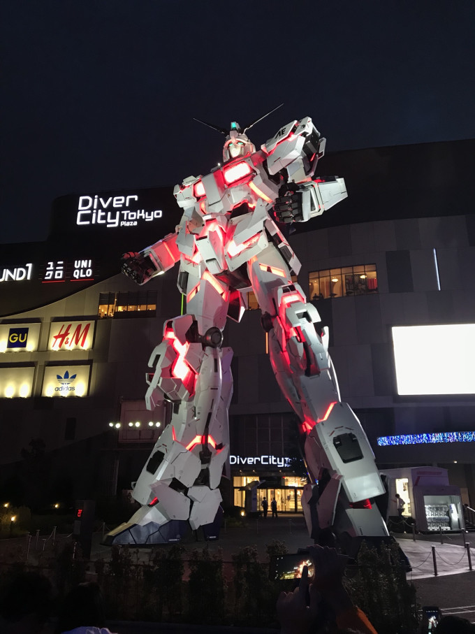 按着商店里的地图穿过美食街就能看到独角兽了~尽管已经看过很多照片啊视频啊之类的,现场看到屹立在大地上的高达还是很震撼~看看高达,逛逛高达咖啡~因为风大,媳妇和睡着的娃在商场里呆着,我也就没在高达咖啡里点个扎古咖啡啥的了。溜达出来正好赶上独角兽的演出,配合uc的动画剪辑,独角兽不断的上演爆甲、“变形”、各种形态的灯光效果等等,着实精彩的很~爽死了~~没白来~