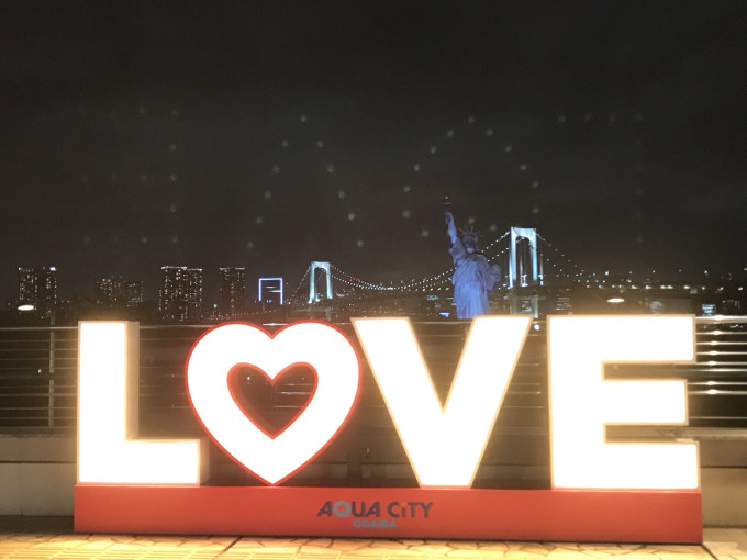 出来之后有个巨大的love灯饰,同时还可以看到东京湾、东京自由女神像和远处的东京塔还有彩虹大桥(可能是吧,不太确定