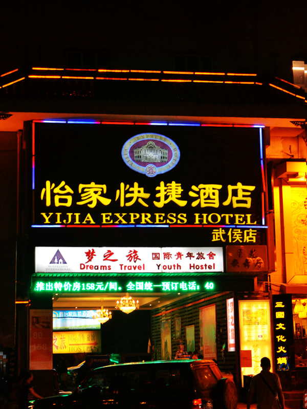 依然如我每次出行时的匆忙,出站,打车,目的地是武侯祠,根据LP上的介绍,打算入住它附近的青年旅社,结果未能如愿。正因为没有事先的精谋细化,反而能让我更率性一些,于是住了青旅旁价格不菲的商务酒店,让我颇为心痛。但实在太累,不想再跑,还好,它的环境还算对得起它昂贵的价格。