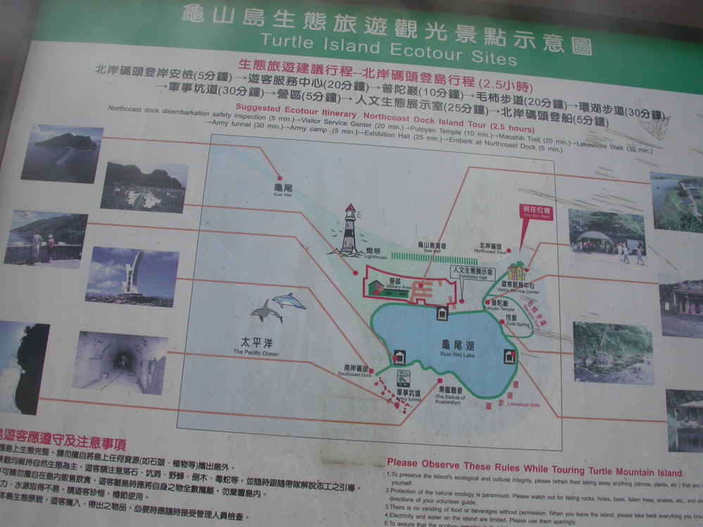 龜山島 , 這隻全世界最大的活烏龜, 說牠活的, 牠還真是活的, 平常沒事, 會戴戴帽子, 還不時在吐氣, 還會來個神龜擺尾, 以前尾巴後面還有兩顆蛋, 後來, 可能孵化了, 就沒再見過了, 說起牠的種種, 且聽我娓娓道來